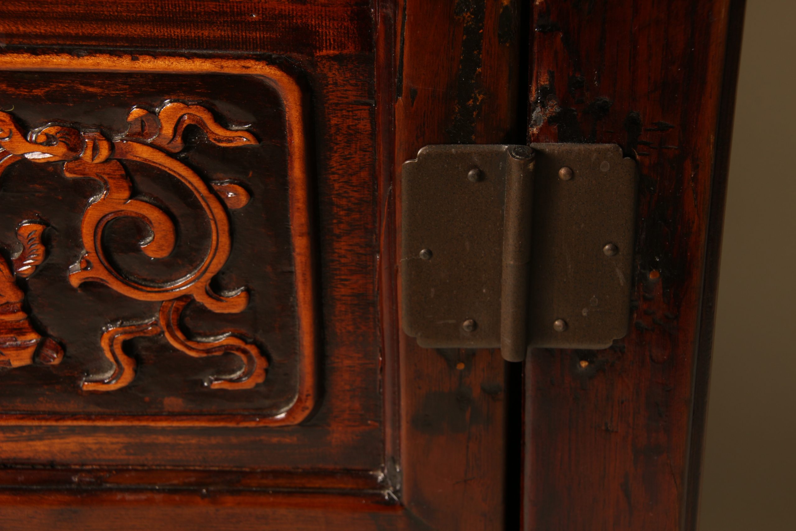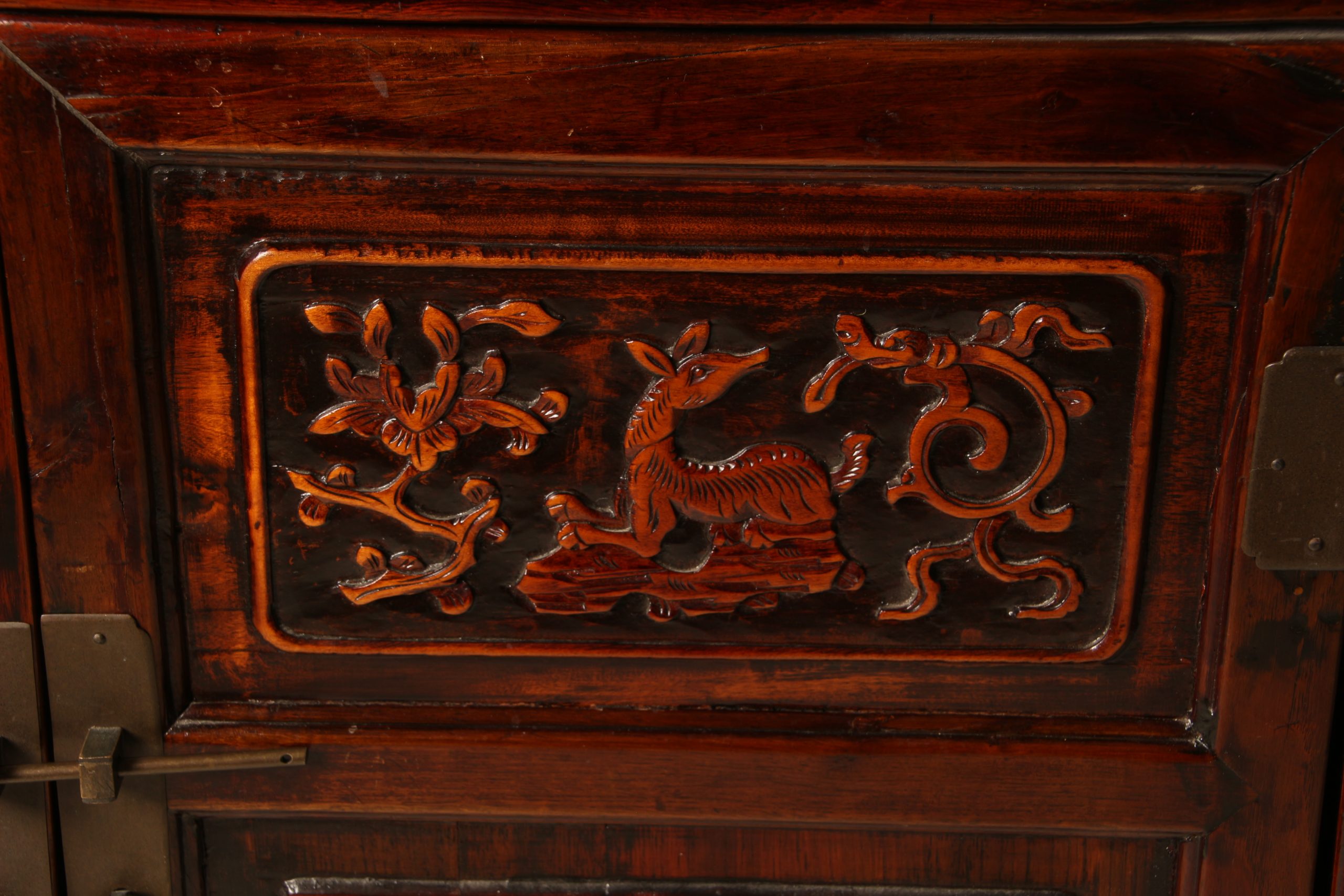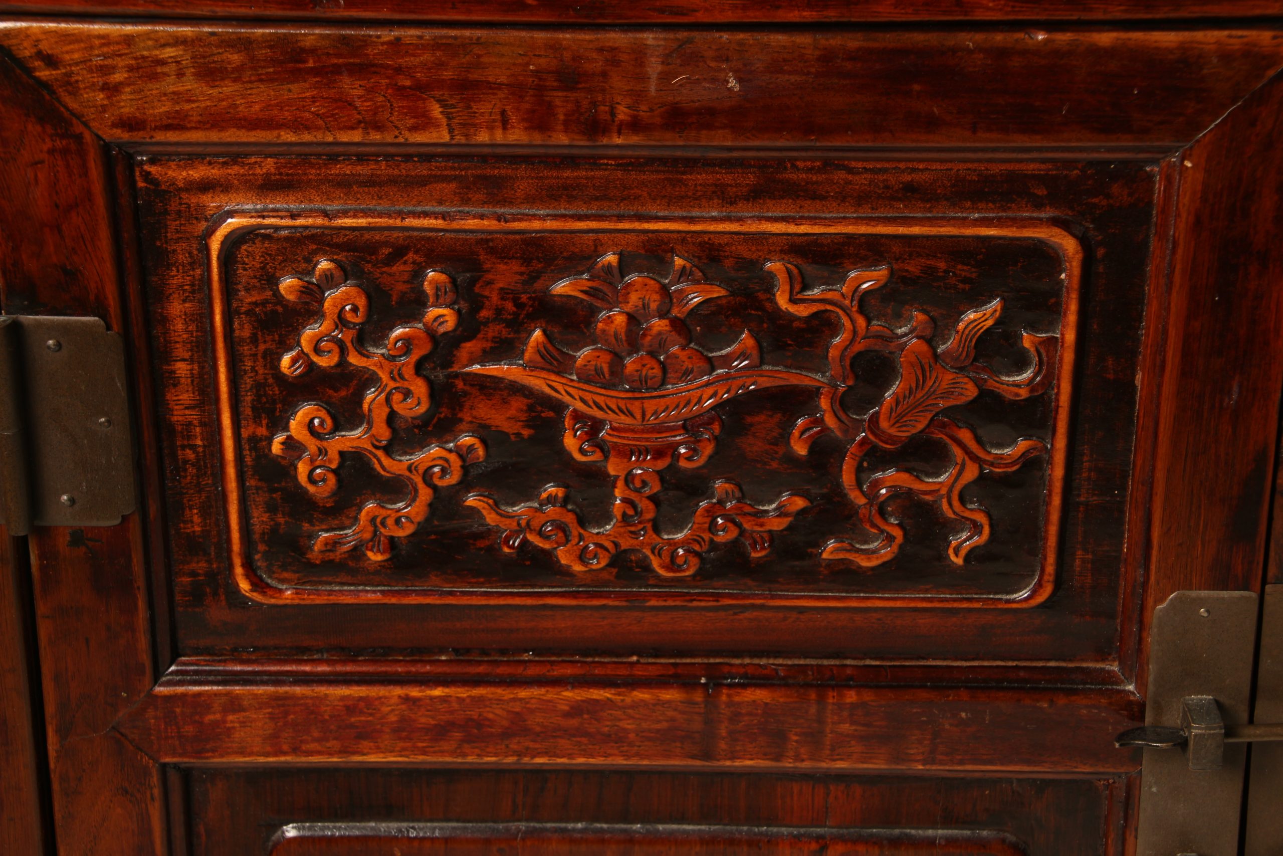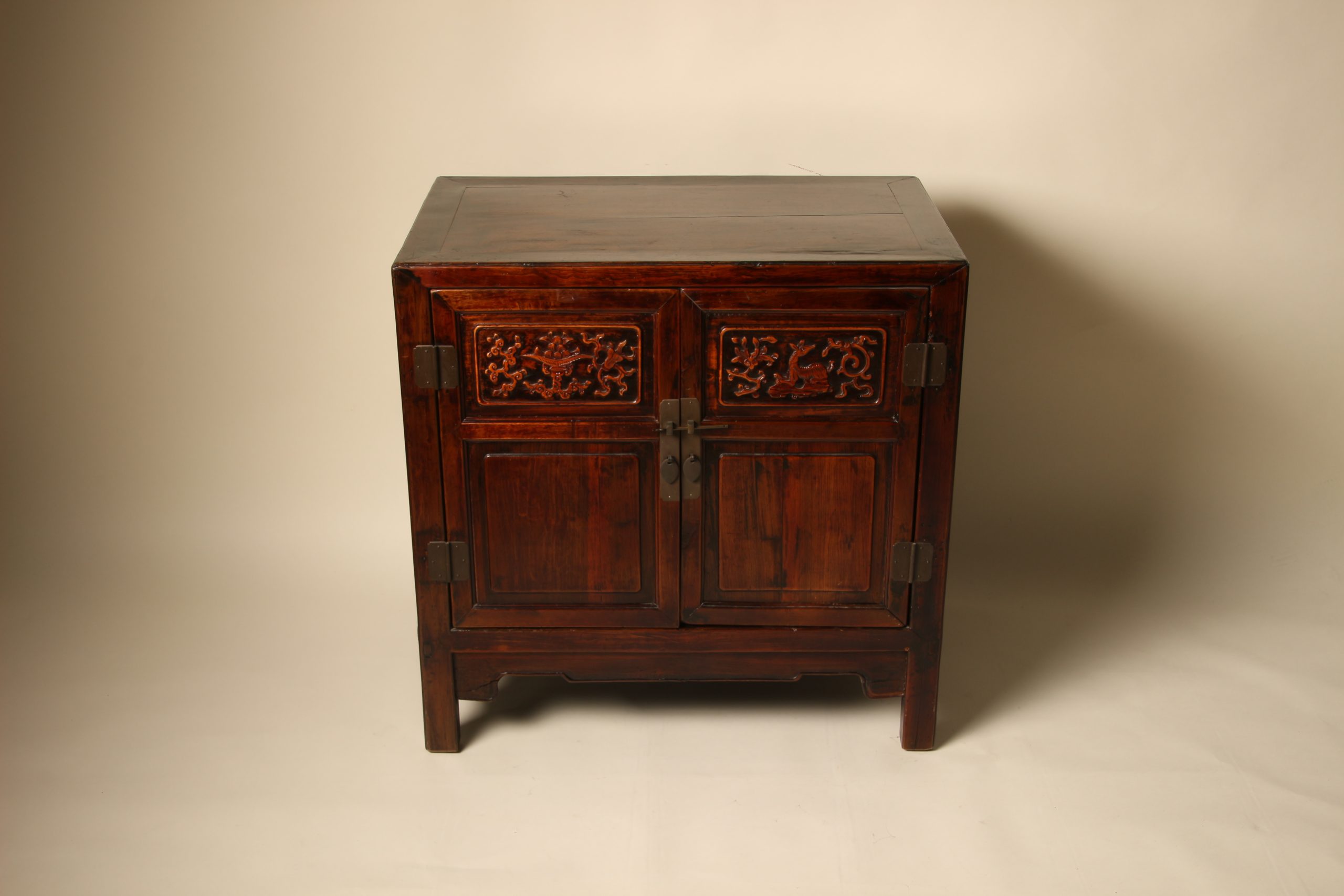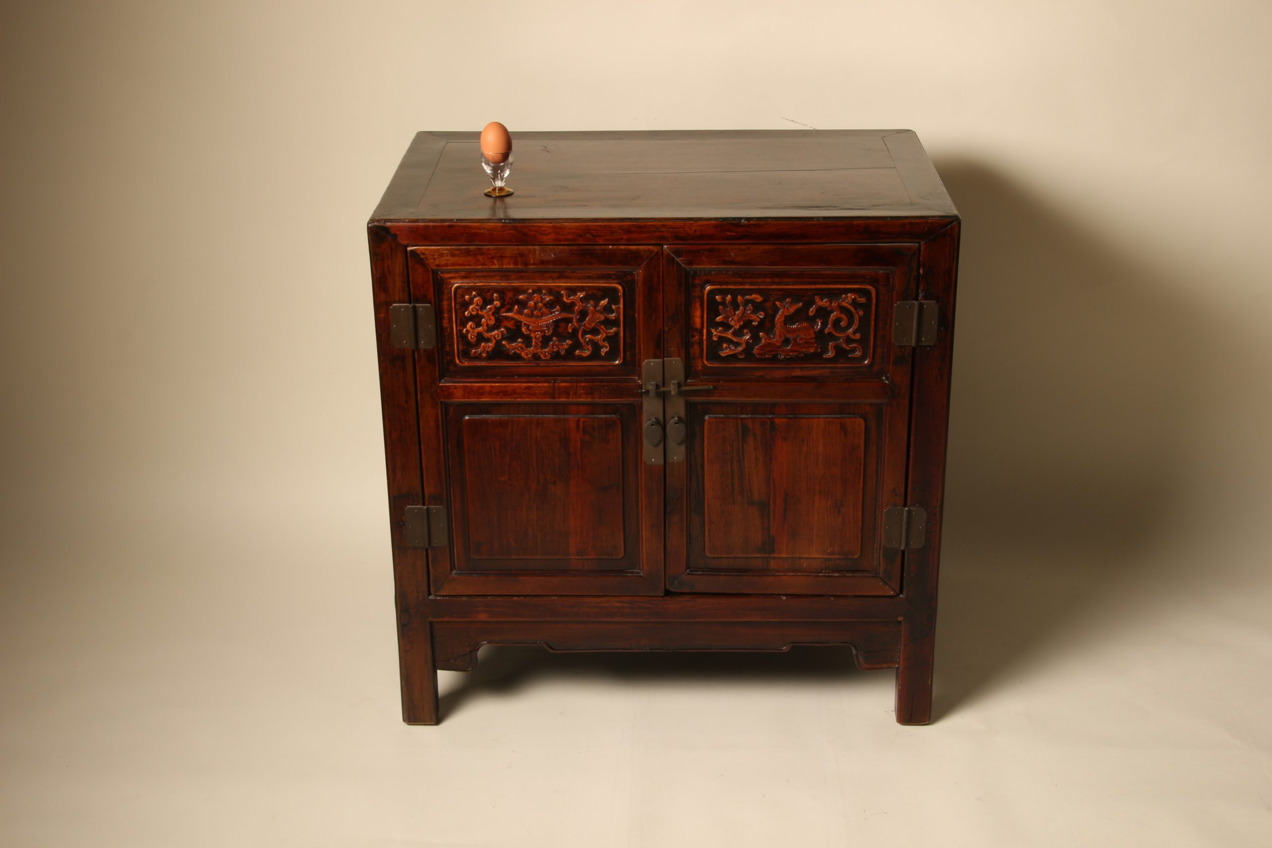 Buffet chinois de la province de Shanxi en orme massif ciré. Deux portes et tiroirs intérieurs. Motifs sculptés sur les parties supérieures des deux portes: un cerf symbole de longévité et de prospérité, entouré de décors floraux et arabesques. Une coupe d’abondance symbole de richesse et de bienfaits, entourée de décors d’arabesques.