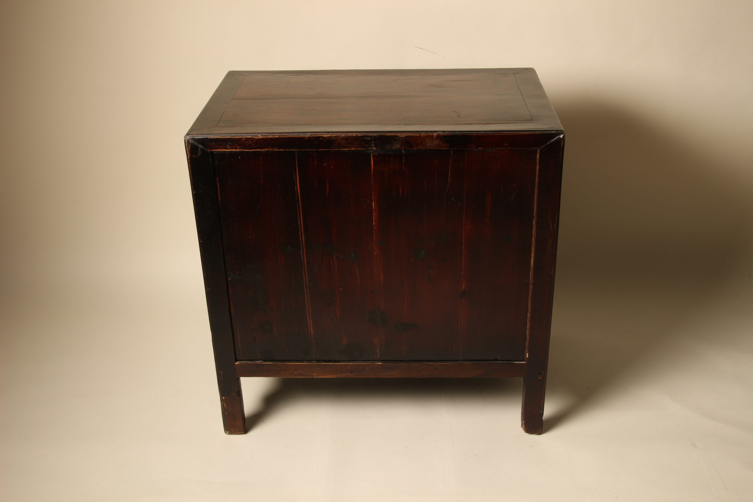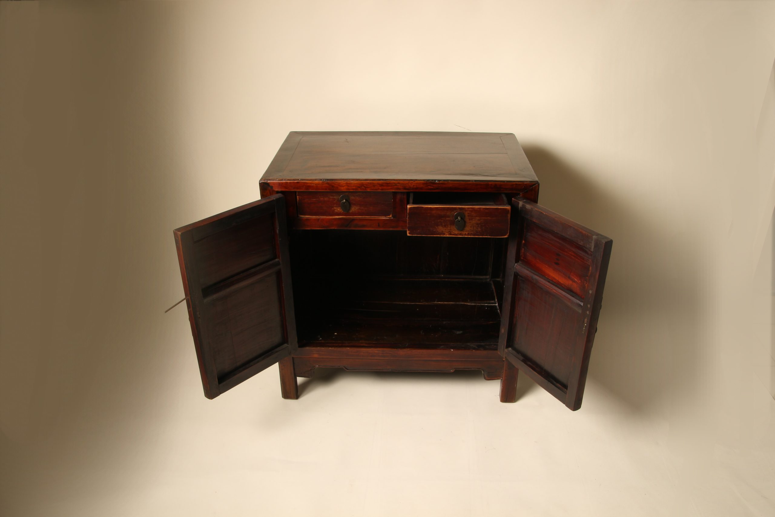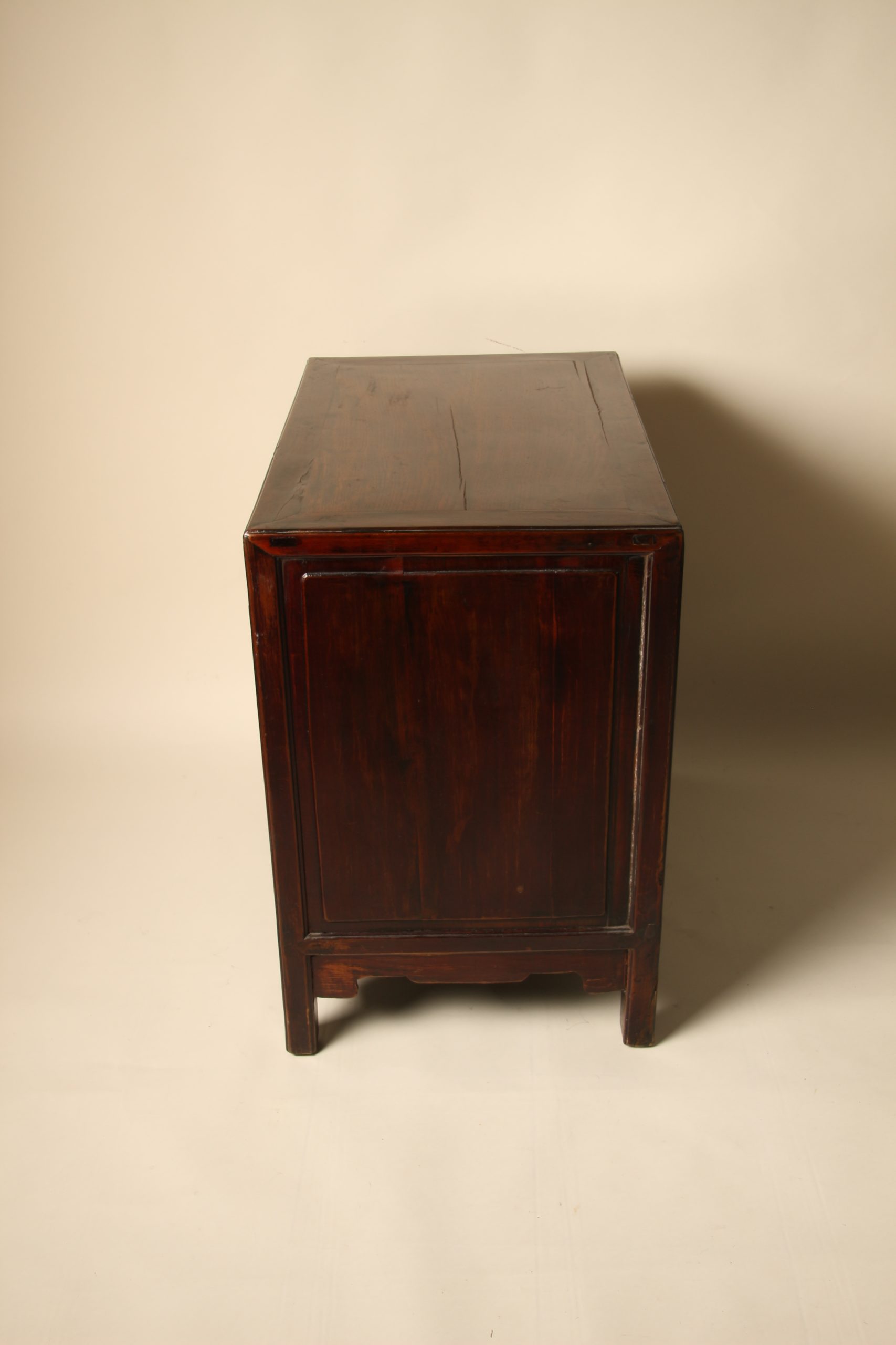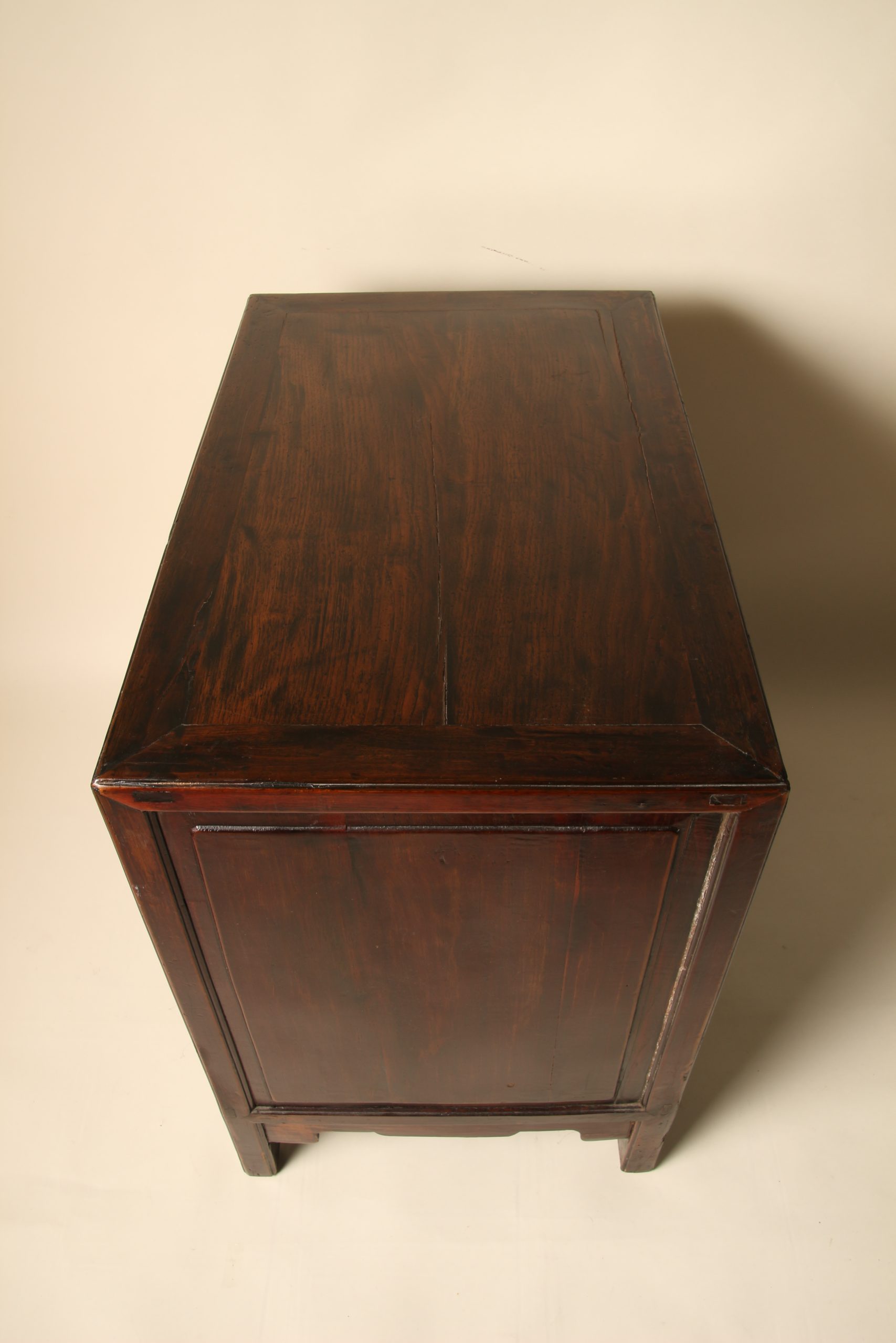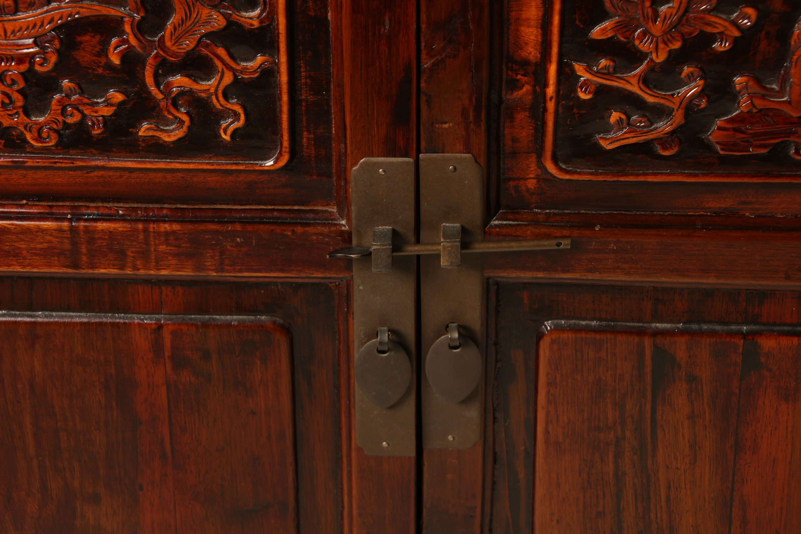 Buffet chinois de la province de Shanxi en orme massif ciré. Deux portes et tiroirs intérieurs. Motifs sculptés sur les parties supérieures des deux portes: un cerf symbole de longévité et de prospérité, entouré de décors floraux et arabesques. Une coupe d’abondance symbole de richesse et de bienfaits, entourée de décors d’arabesques.