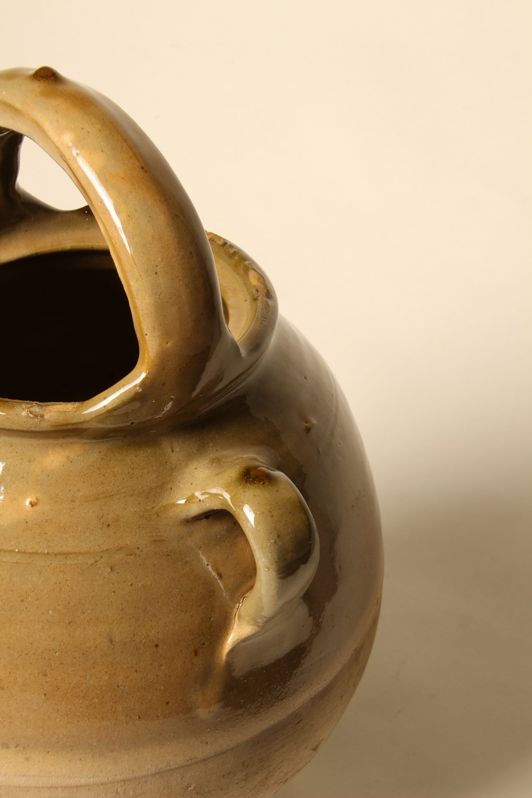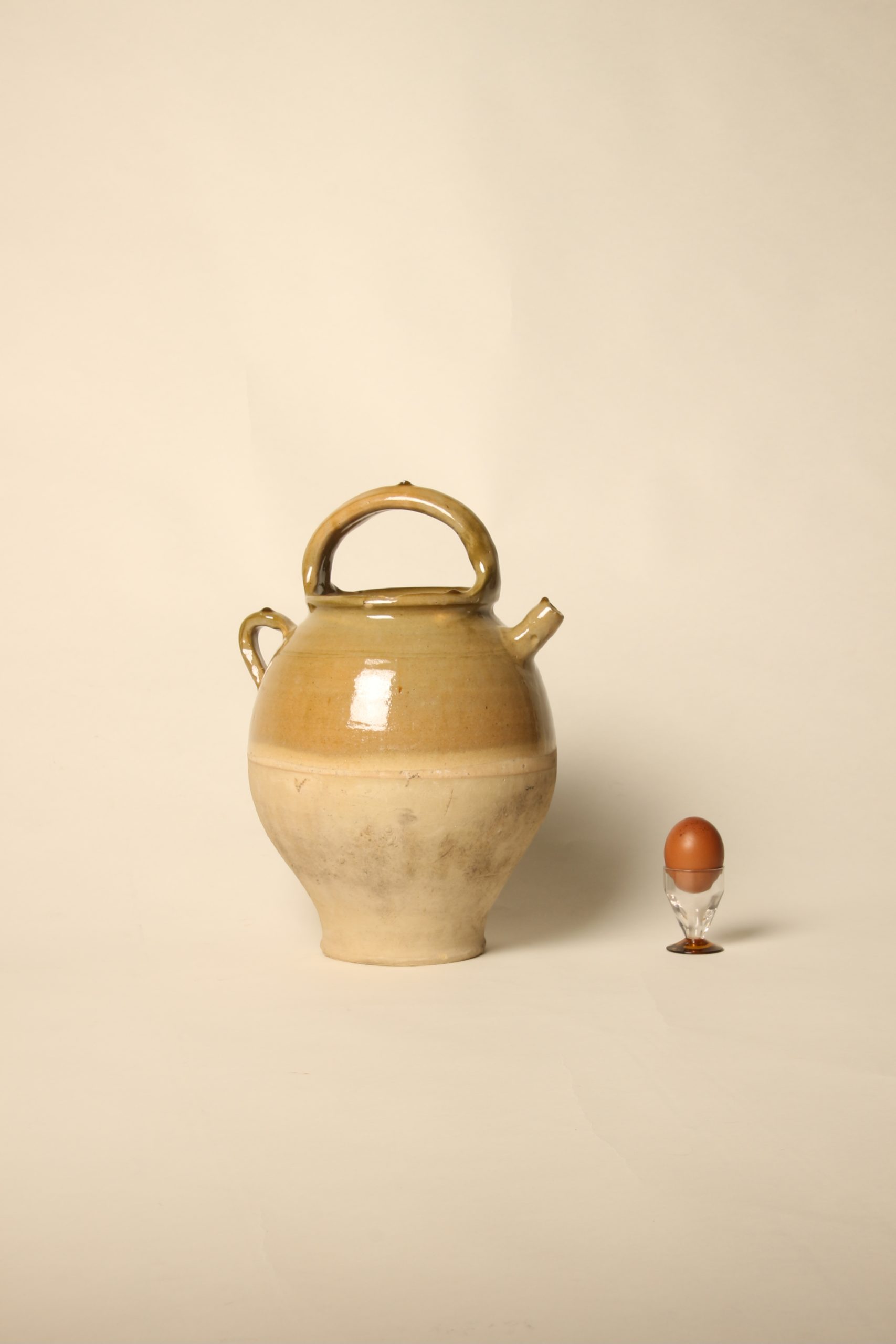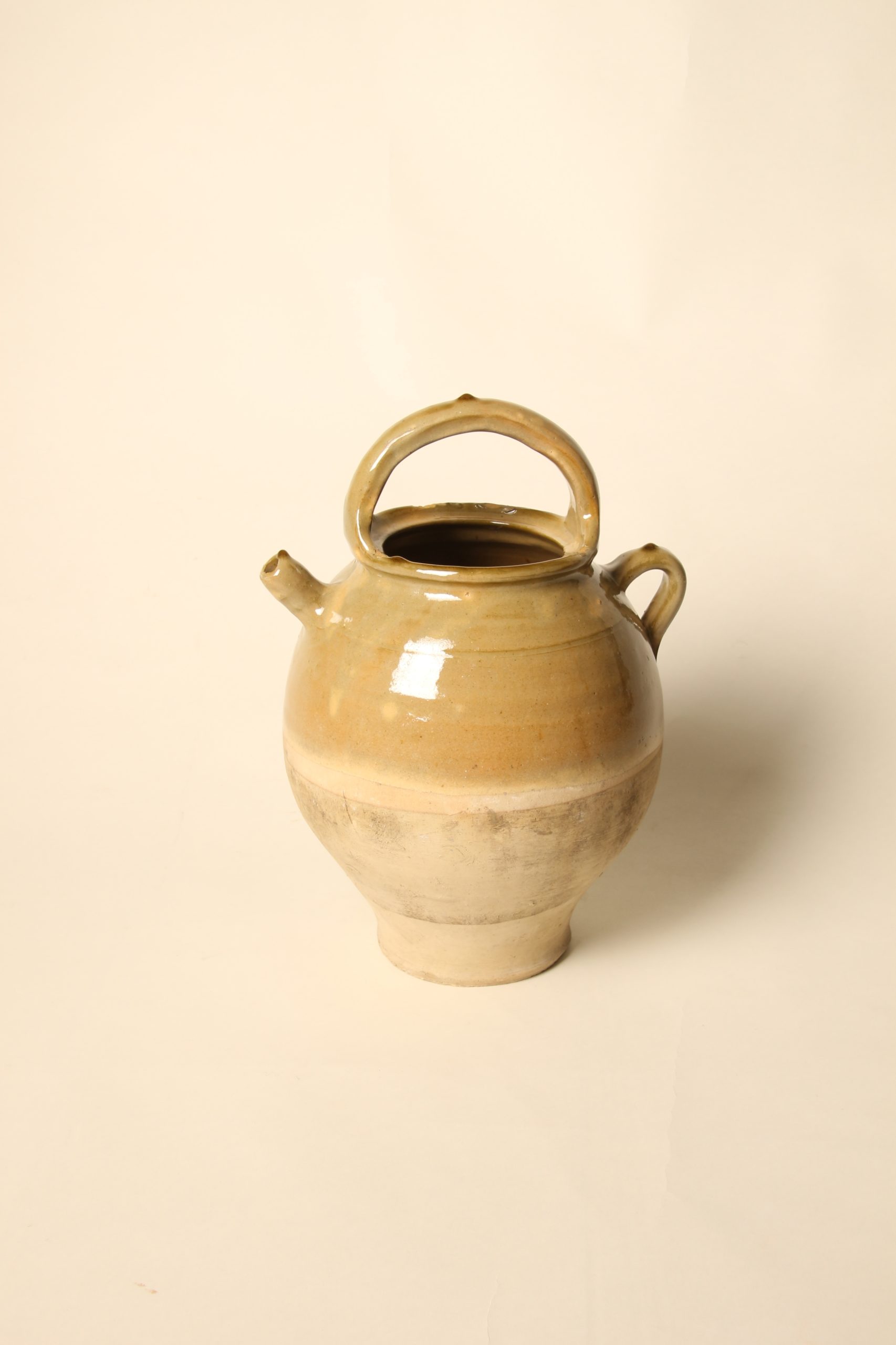 Grande chevrette provençale en terre cuite. Émaillée main par trempage sur la partie supérieure qui comprend l’anse, la poignet et le bec verseur. Couleur miel foncé.