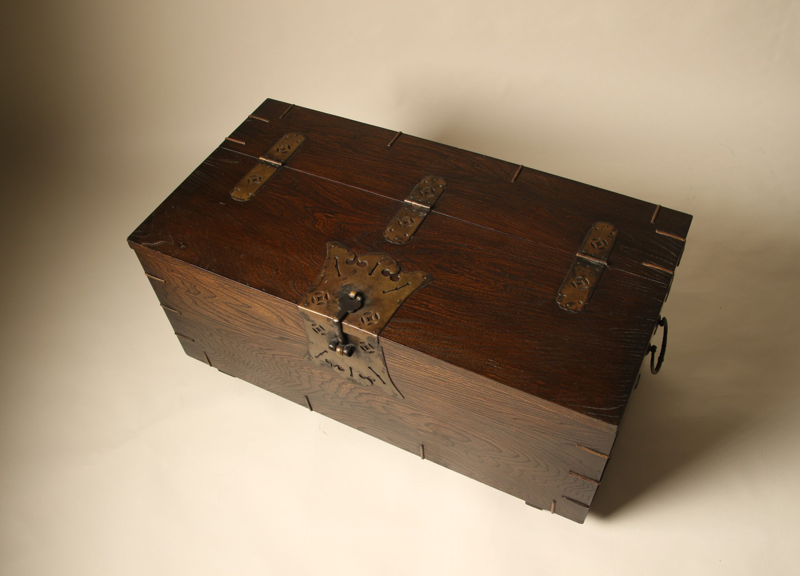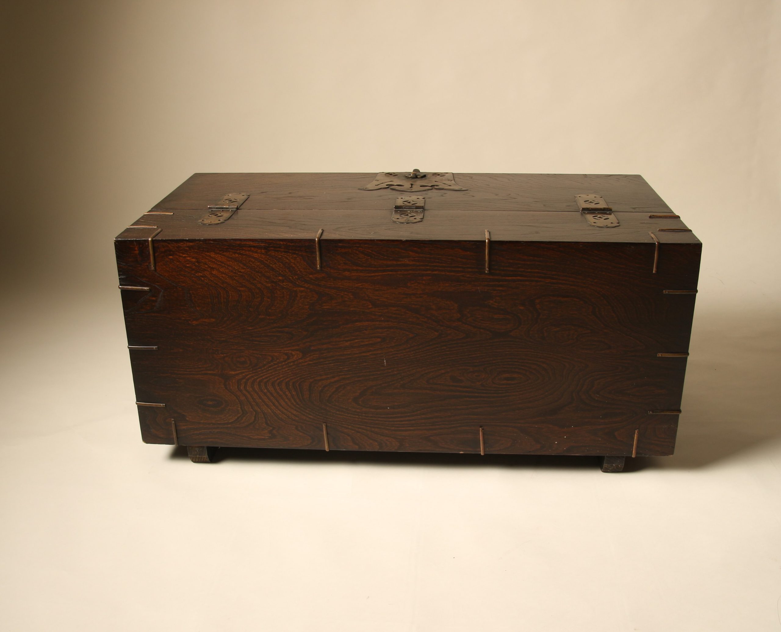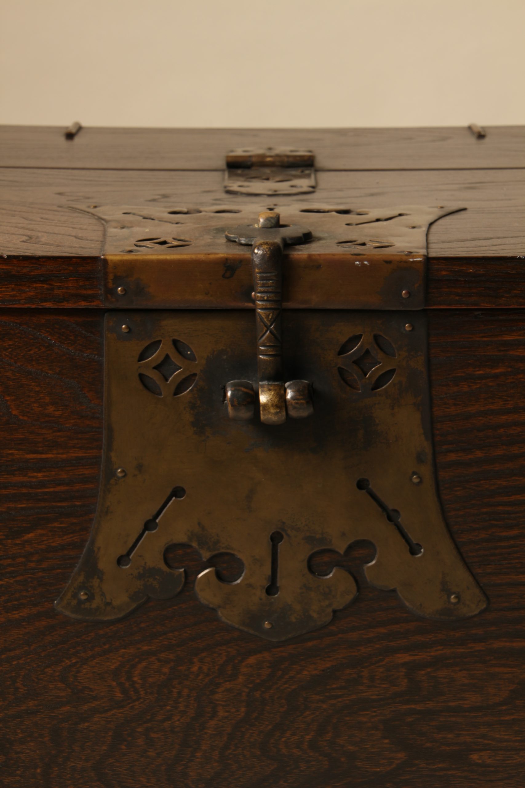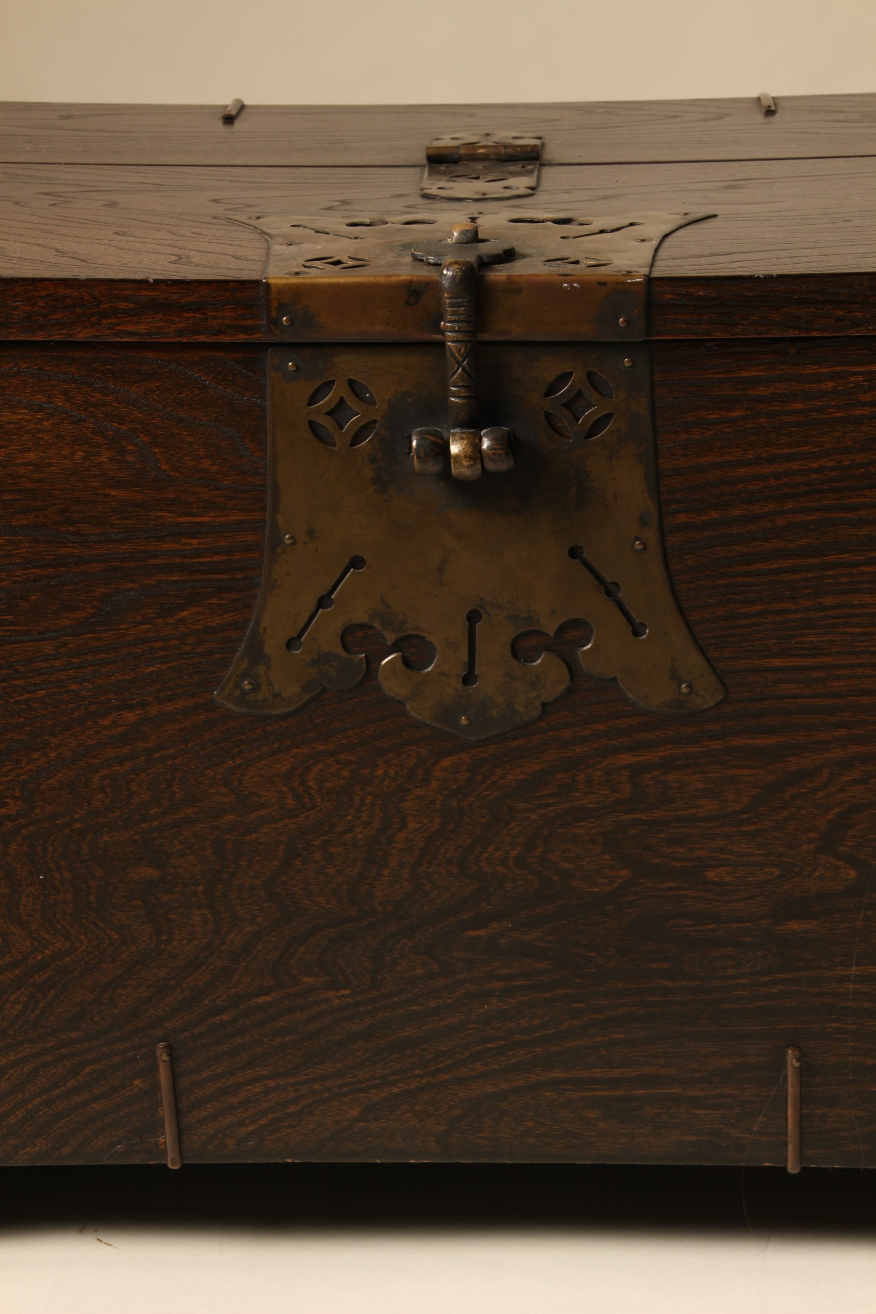 Coffre Coréen en plaquage de palissandre, rehaussé de ferrures décorées en bronze comprenant une serrure, des renforts, deux poignets et des charnières.