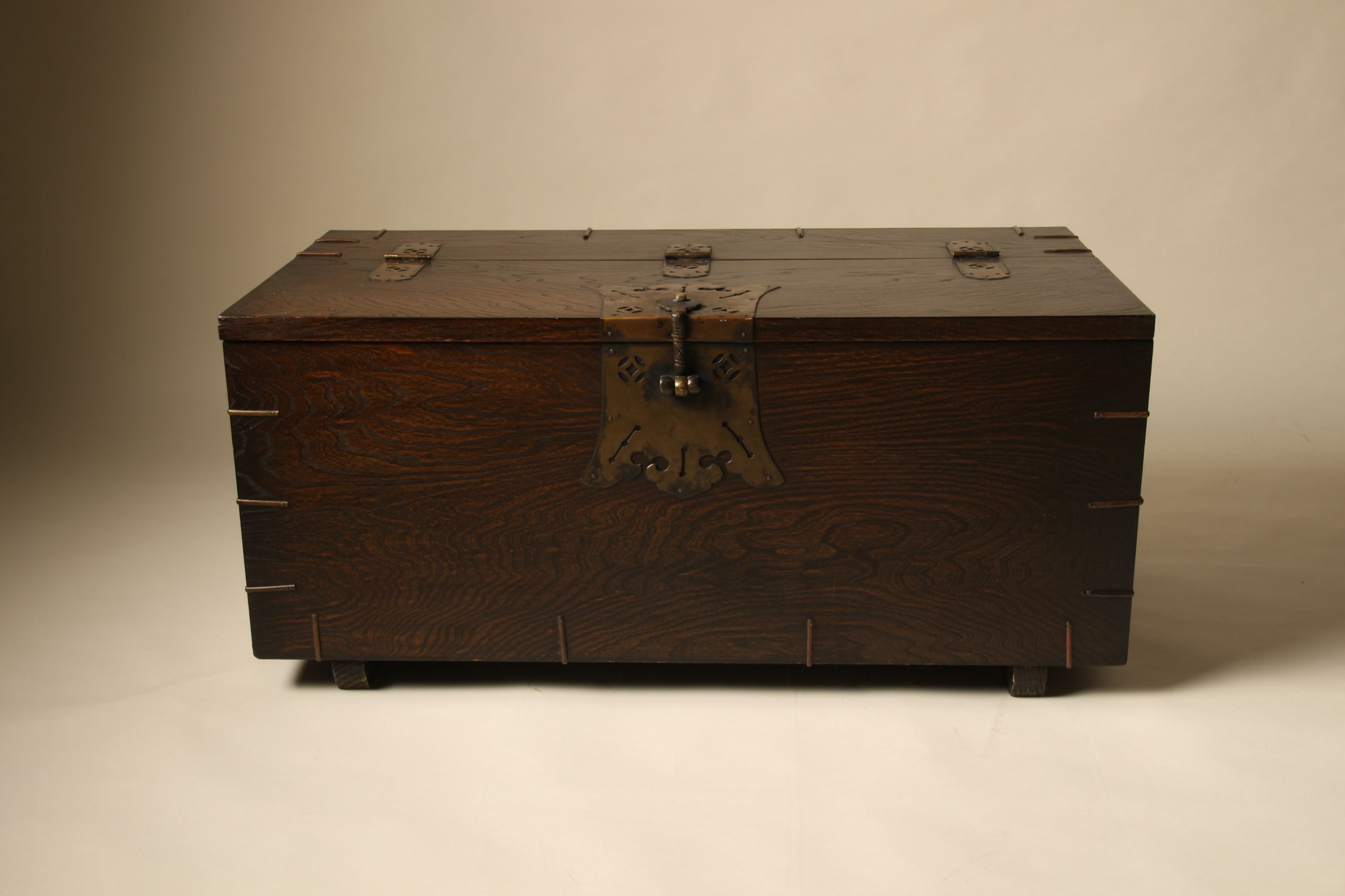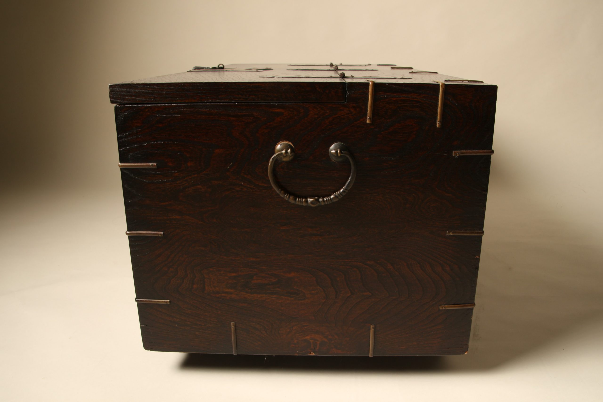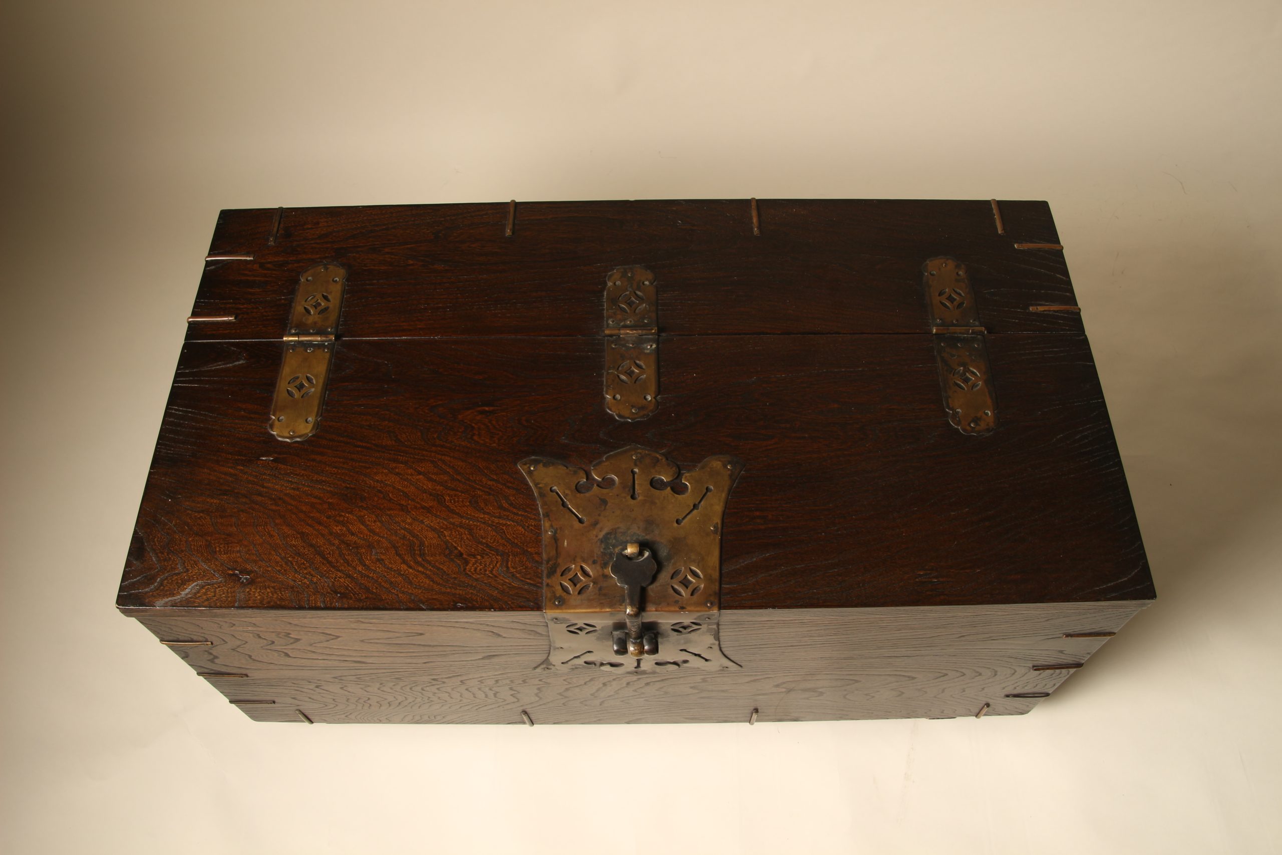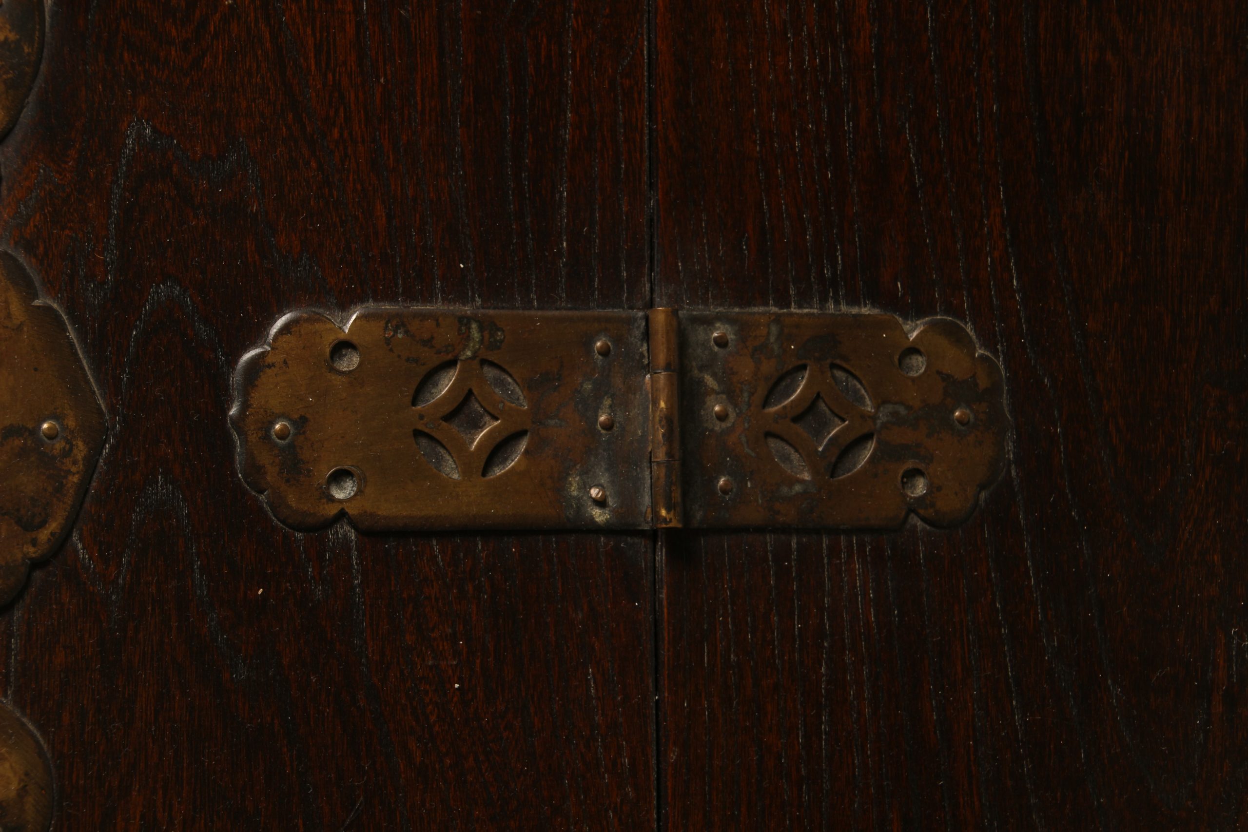 Coffre Coréen en plaquage de palissandre, rehaussé de ferrures décorées en bronze comprenant une serrure, des renforts, deux poignets et des charnières.