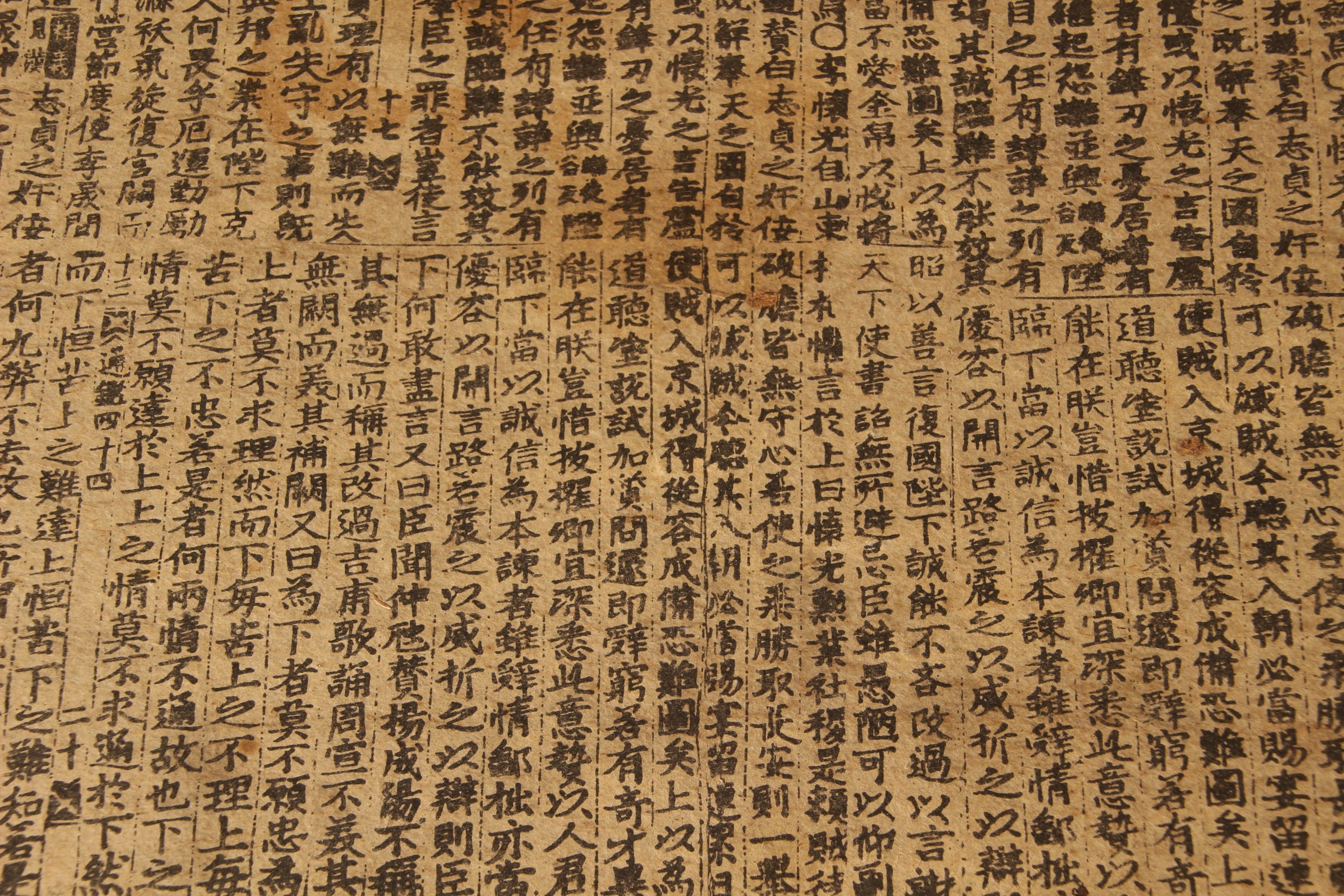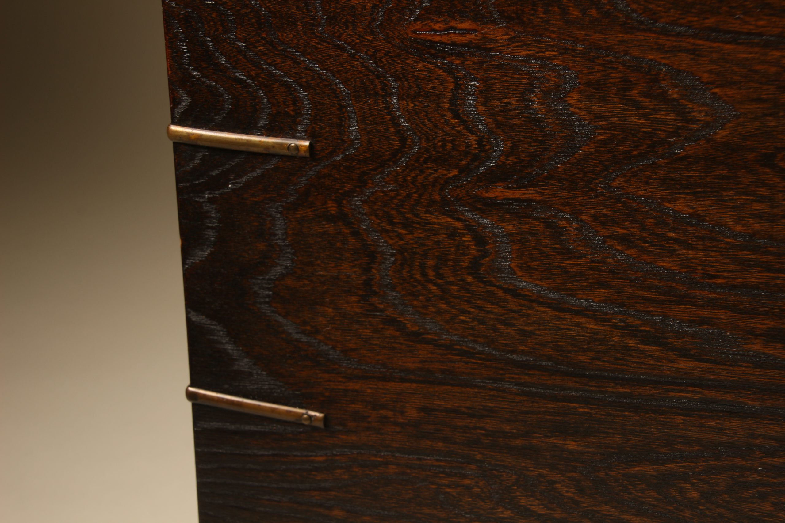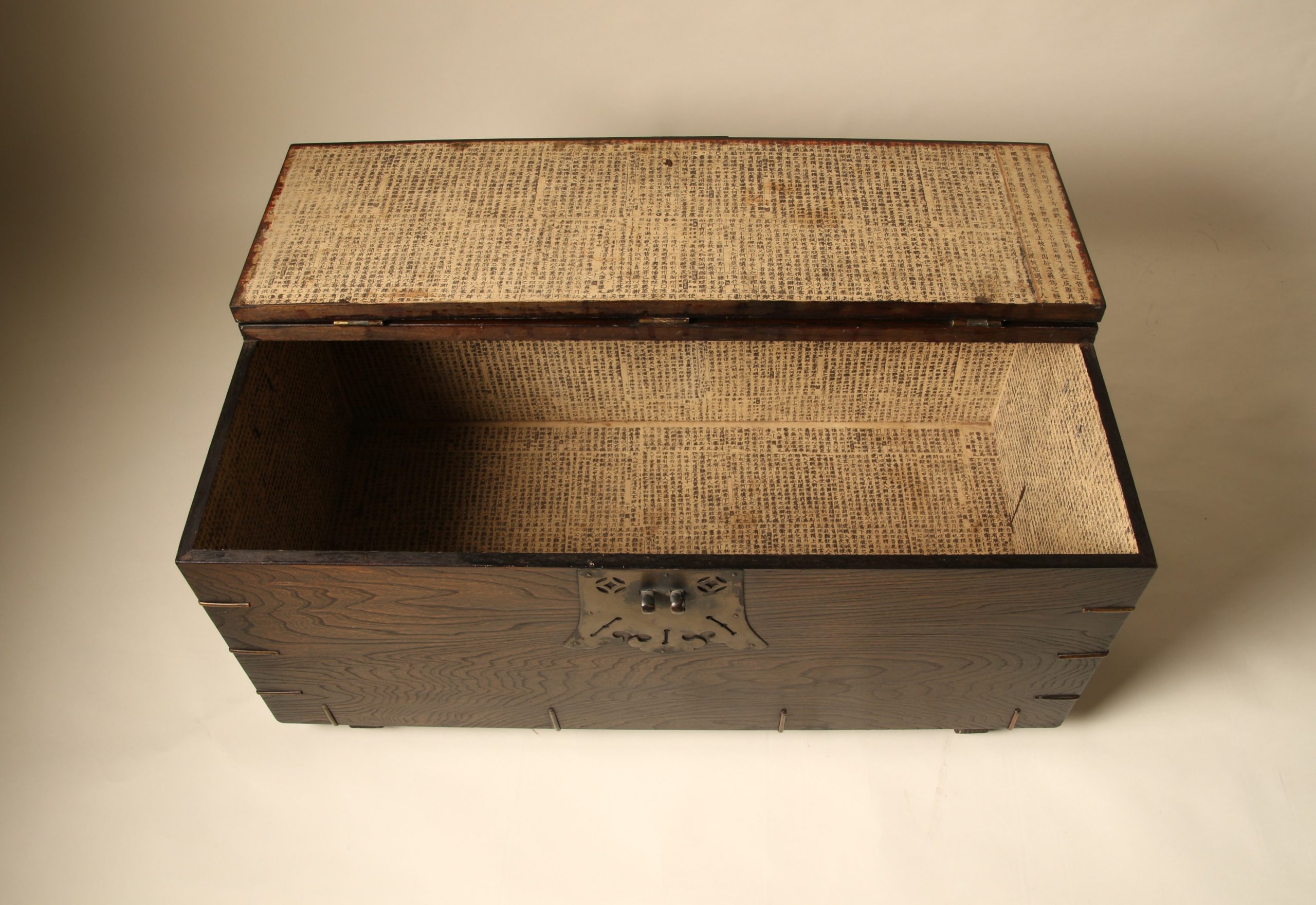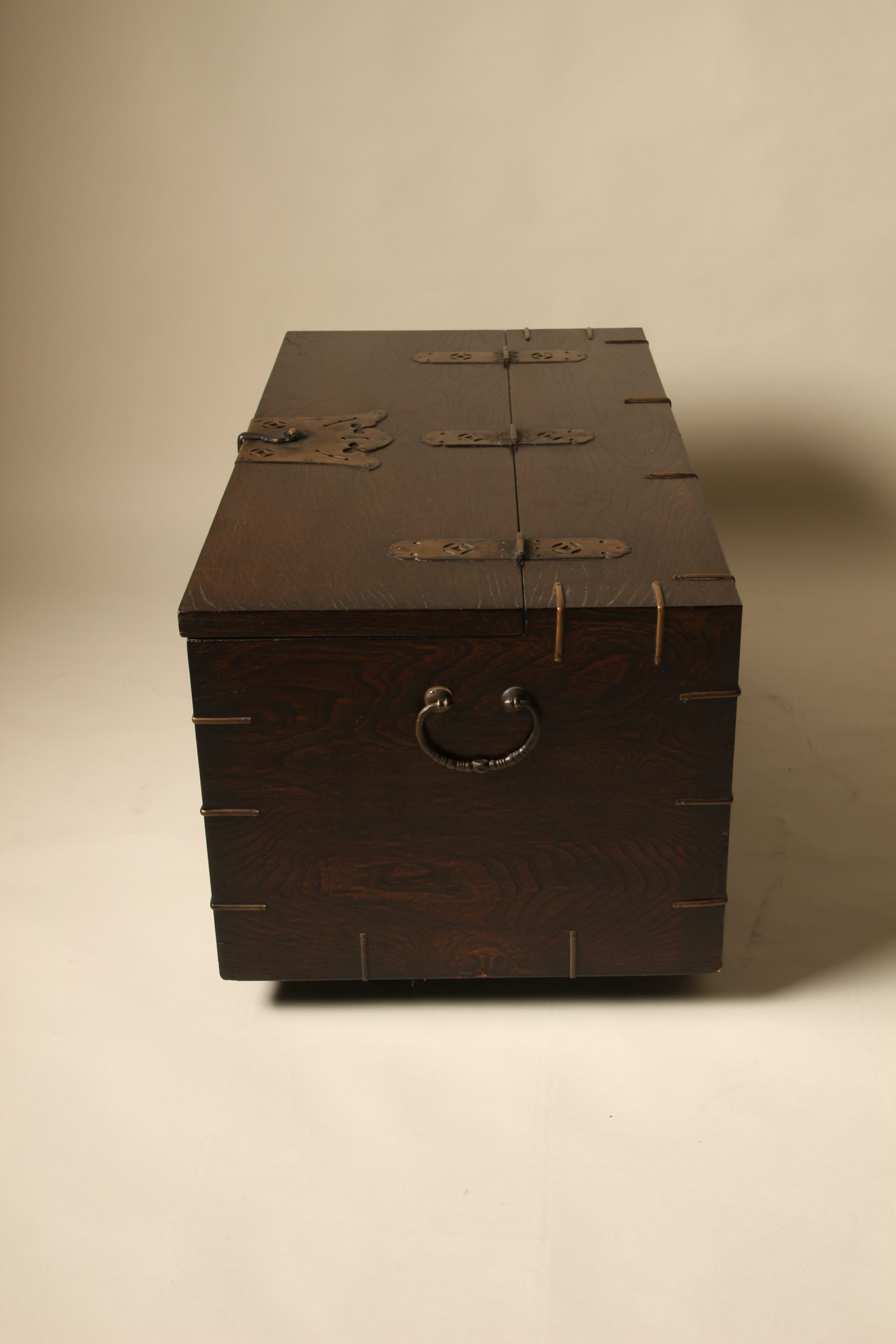 Coffre Coréen en plaquage de palissandre, rehaussé de ferrures décorées en bronze comprenant une serrure, des renforts, deux poignets et des charnières.