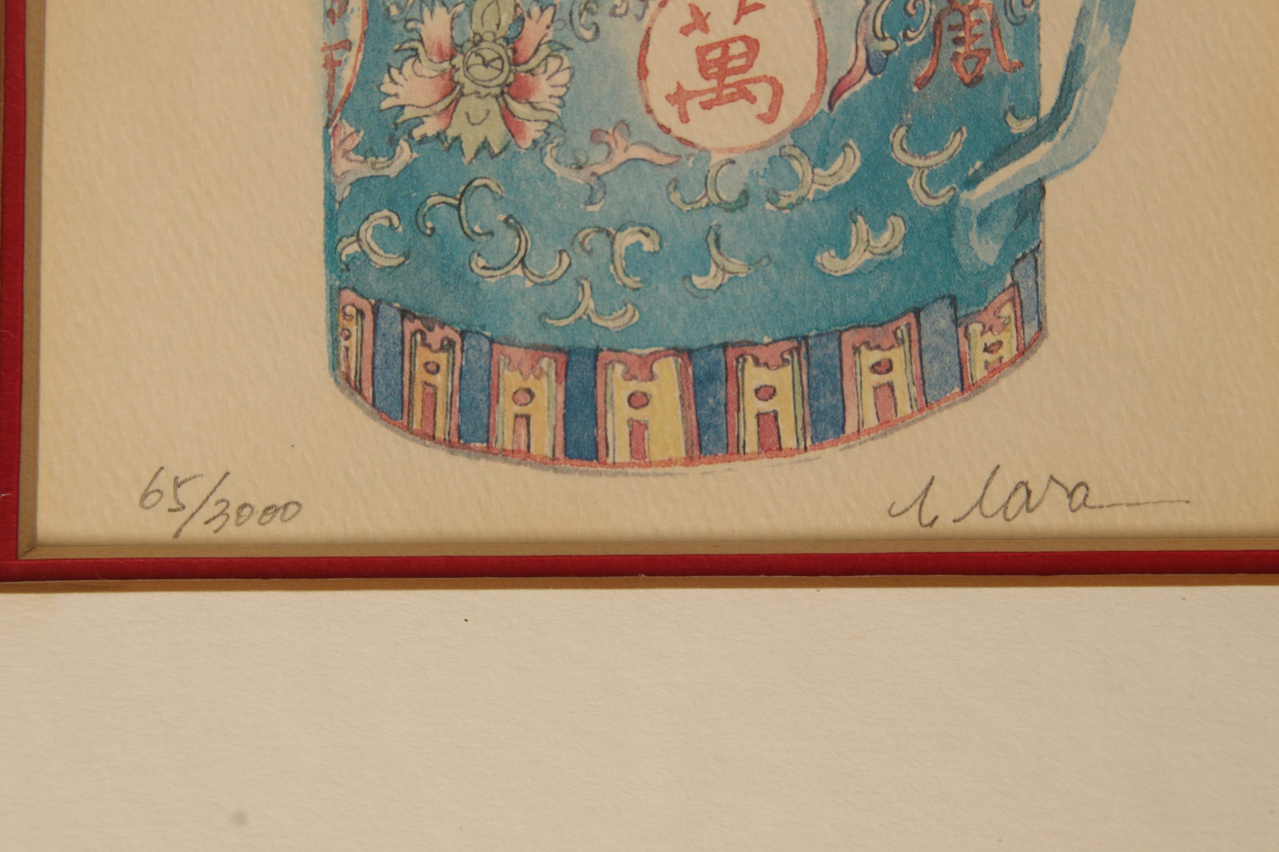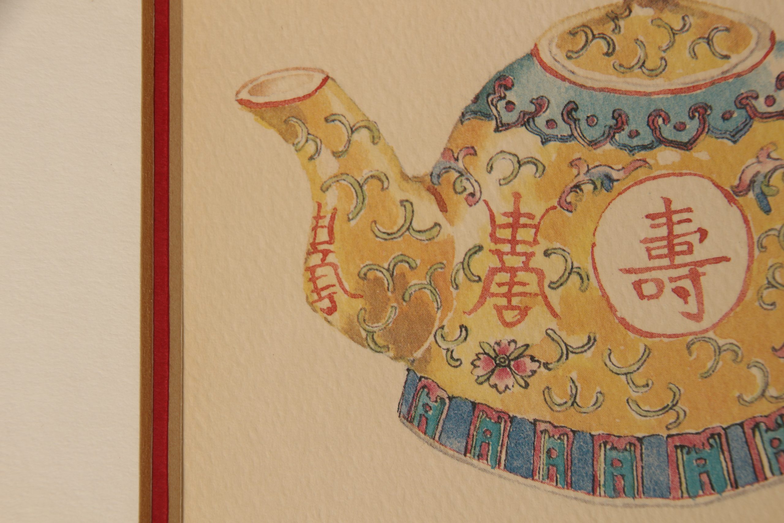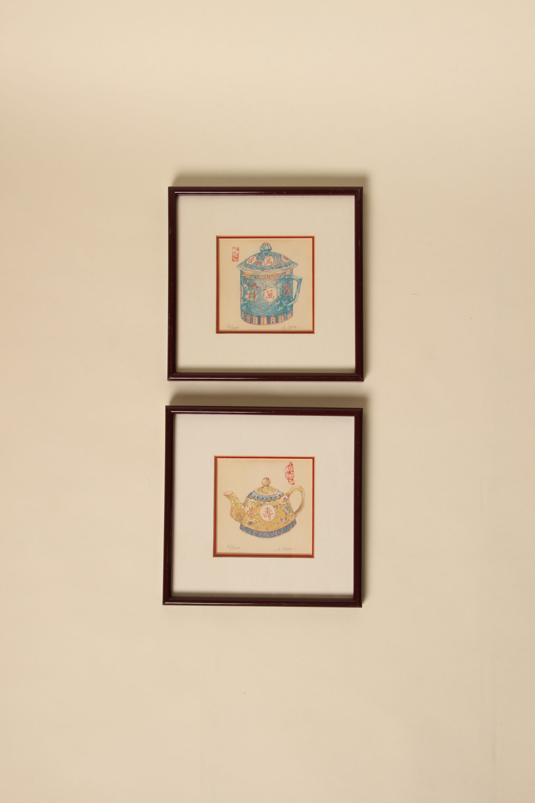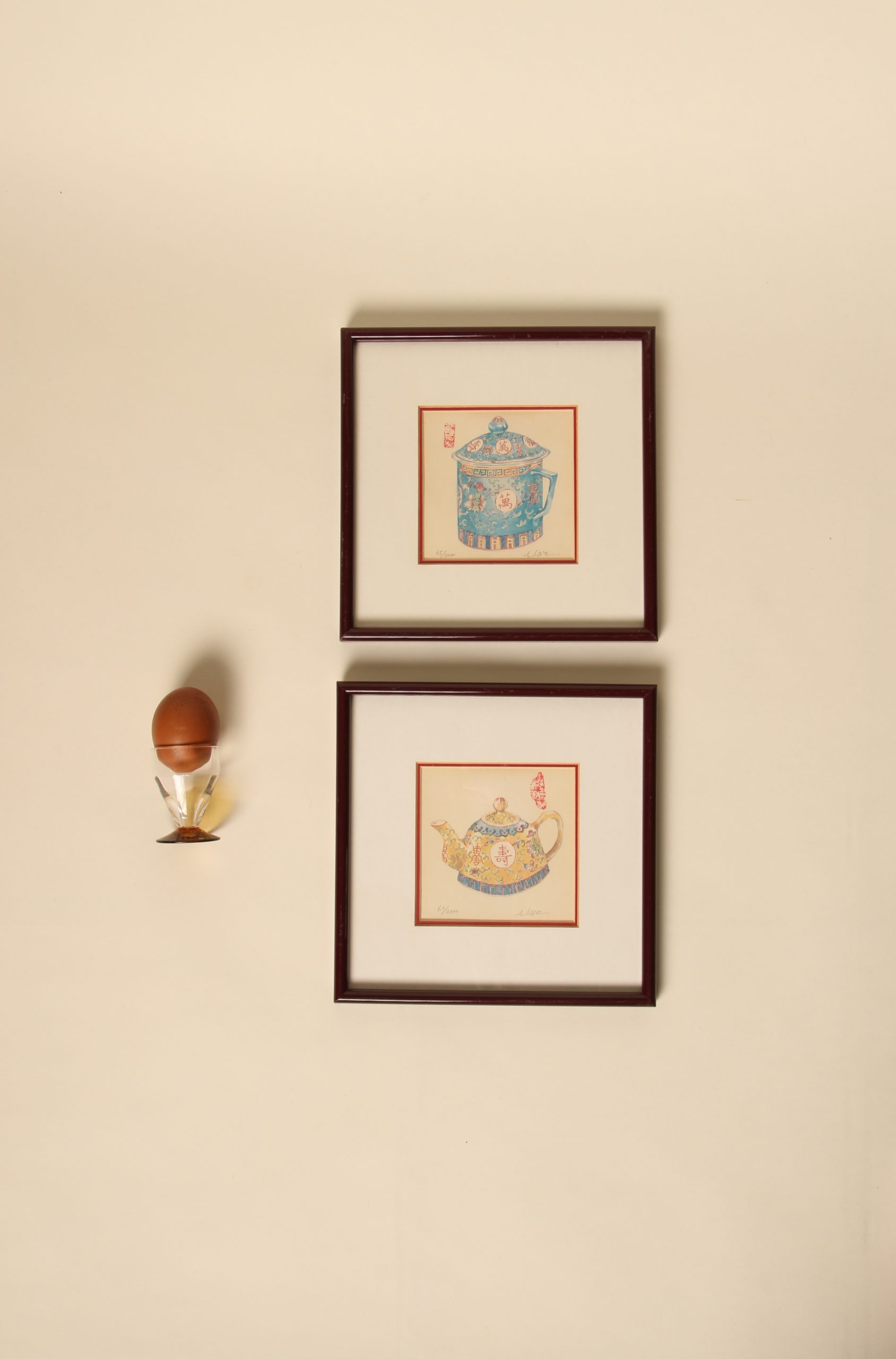 Deux impressions d’art signées et numérotées 65/3000 et 67/3000 de Clara Hung Mei Yee. Représentant deux aquarelles: une théière et un sucrier en porcelaine de Canton chinoise.