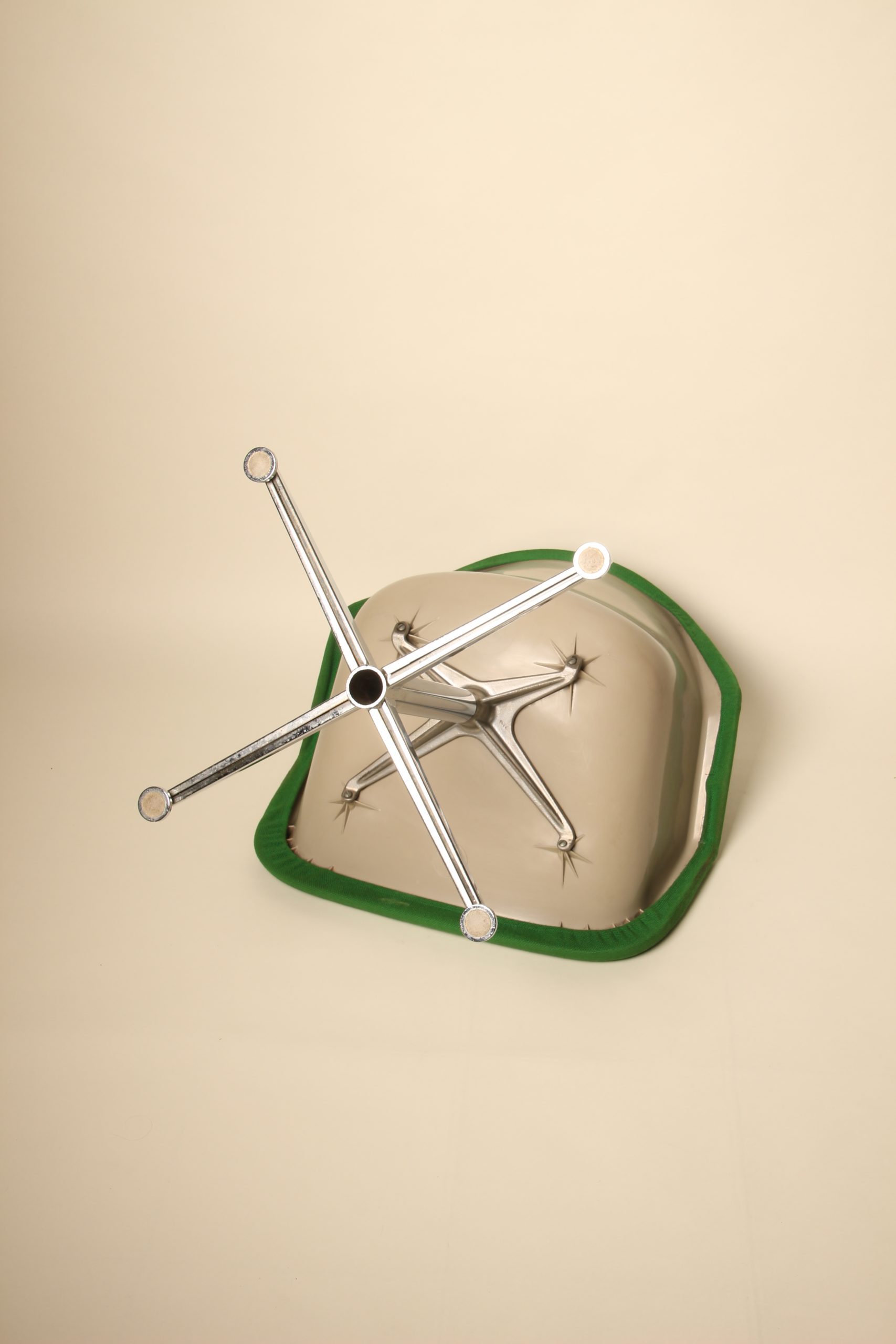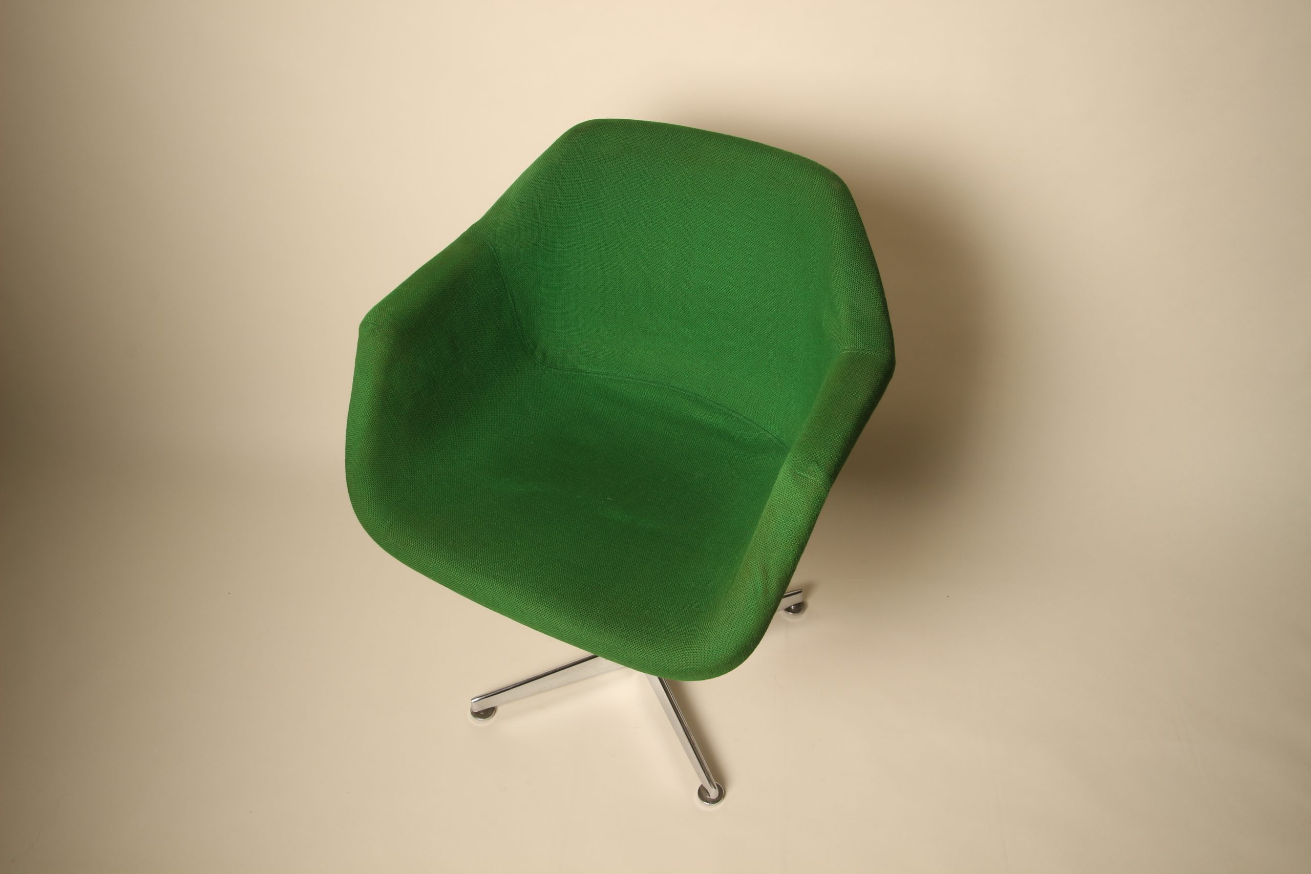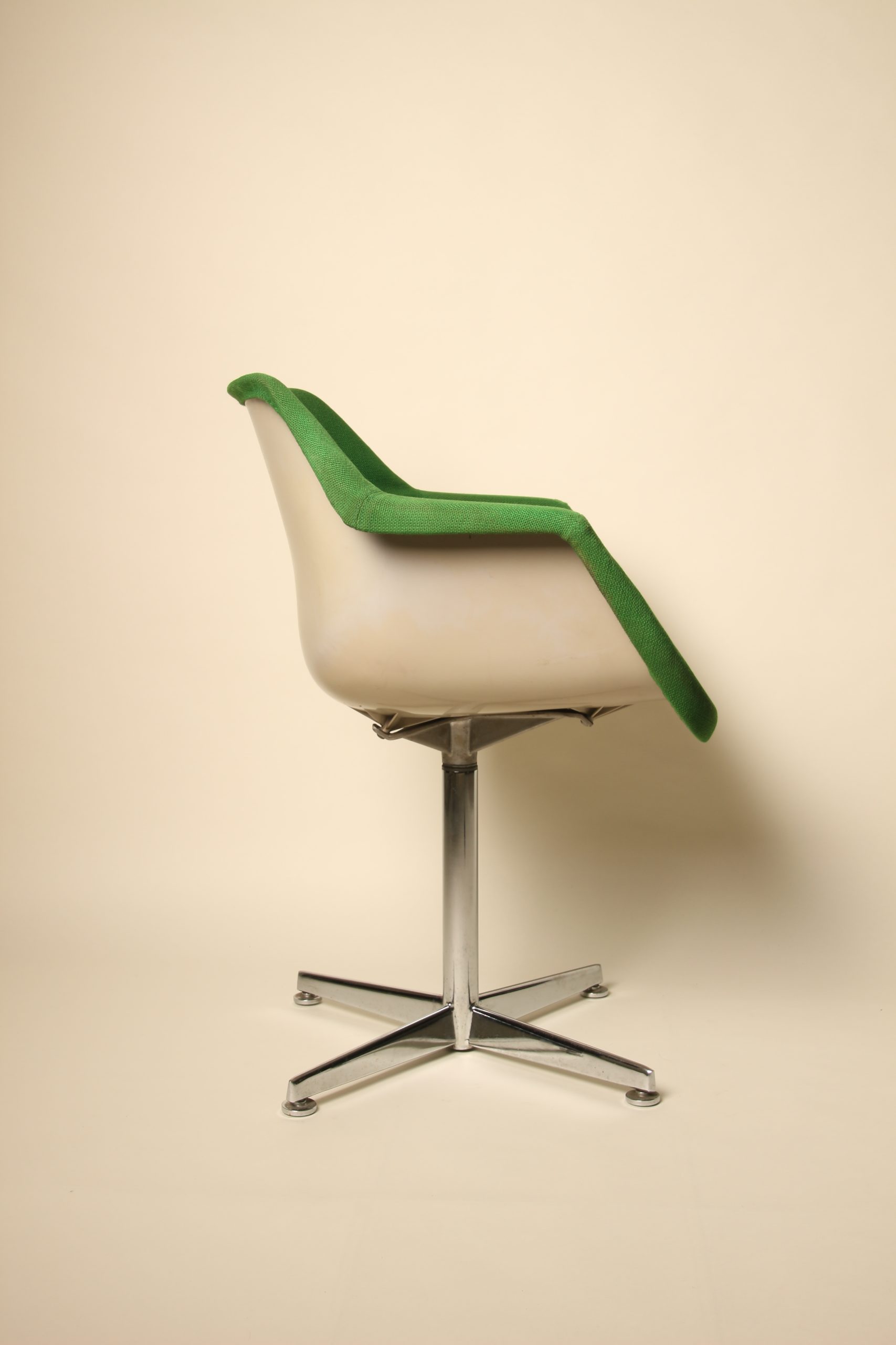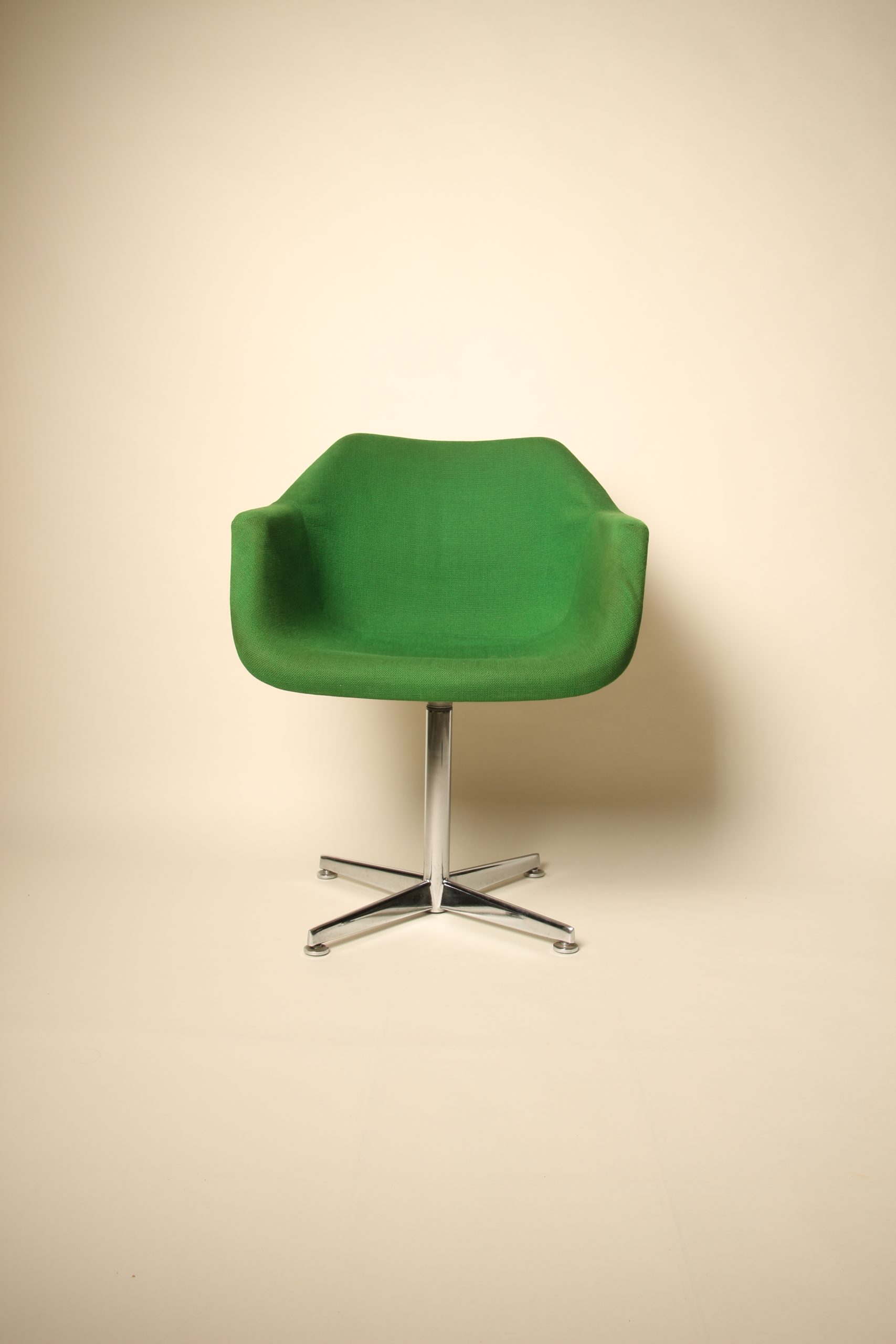 Coque en polypropène thermoformé de couleur ivoire avec revêtement en tissu vert intense, piètement à quatre branches en aluminium chromé non pivotant.