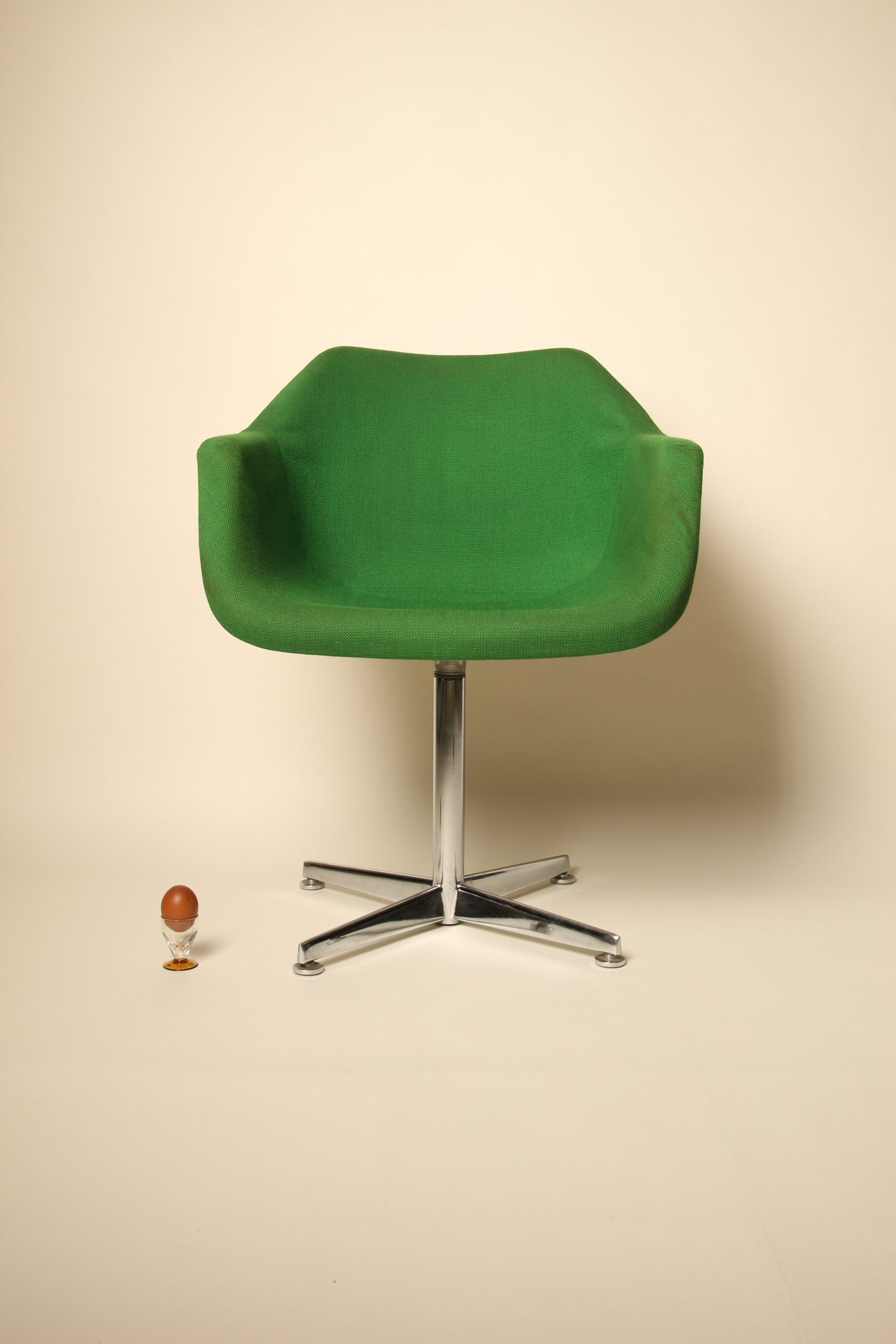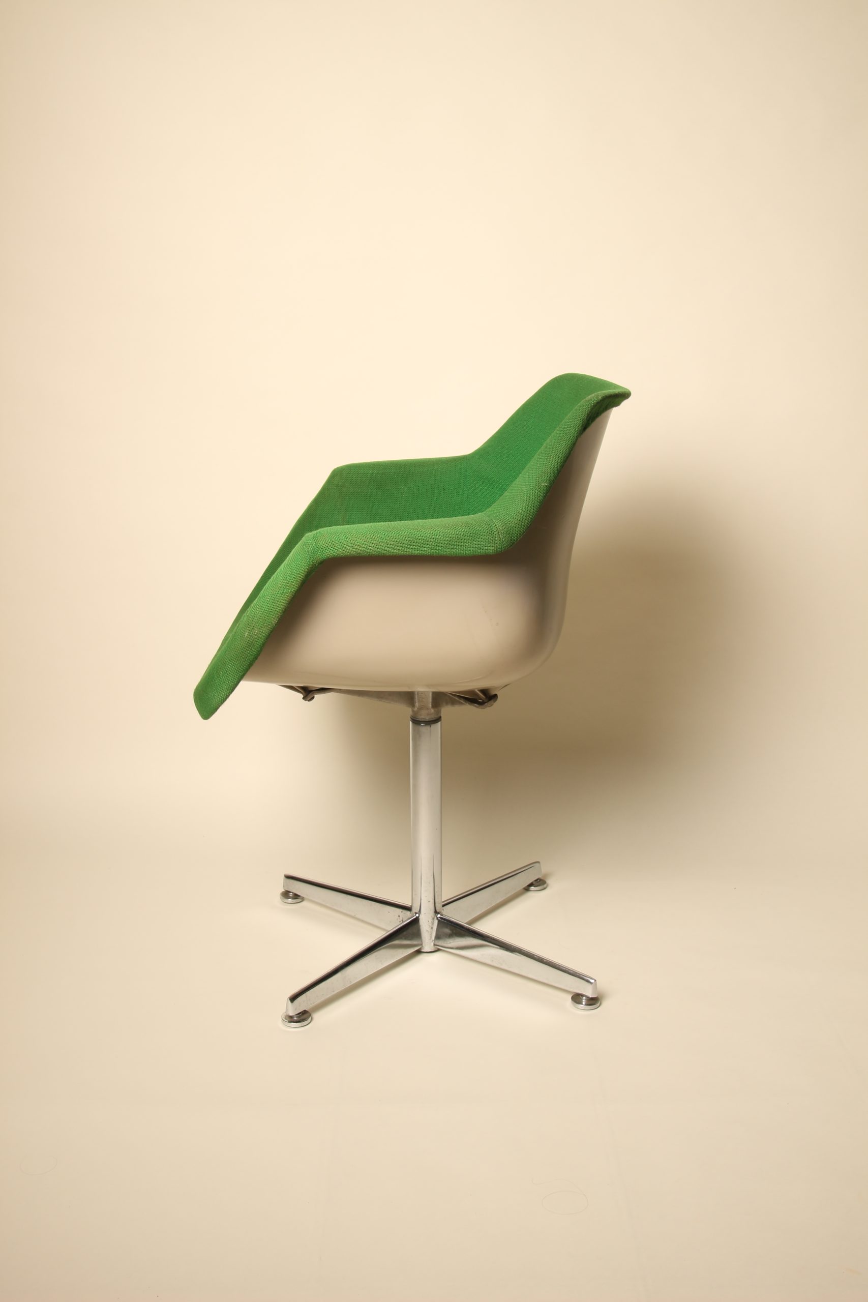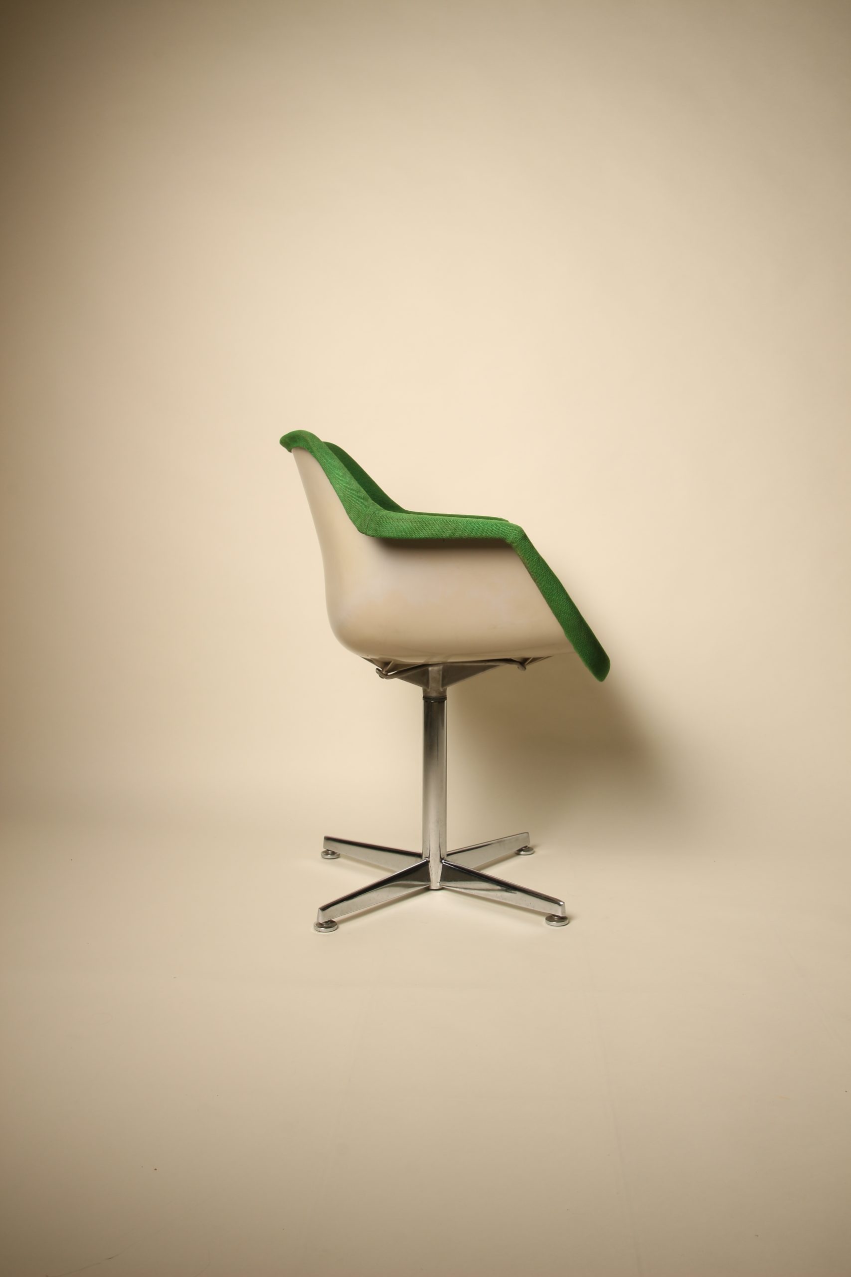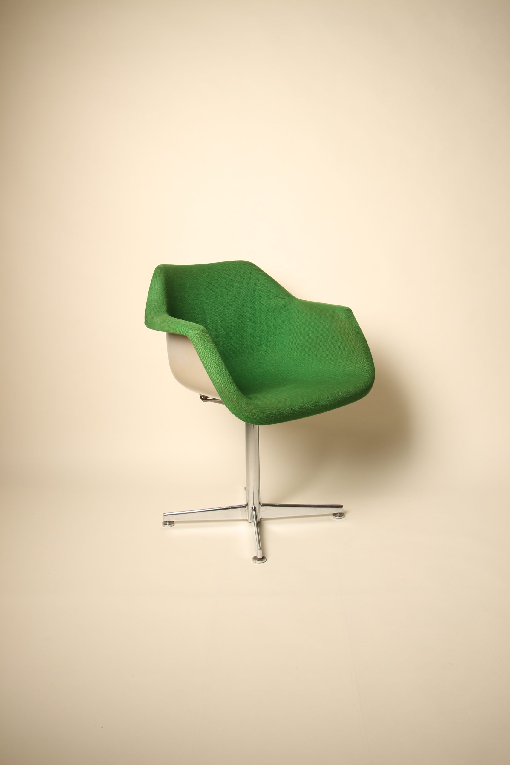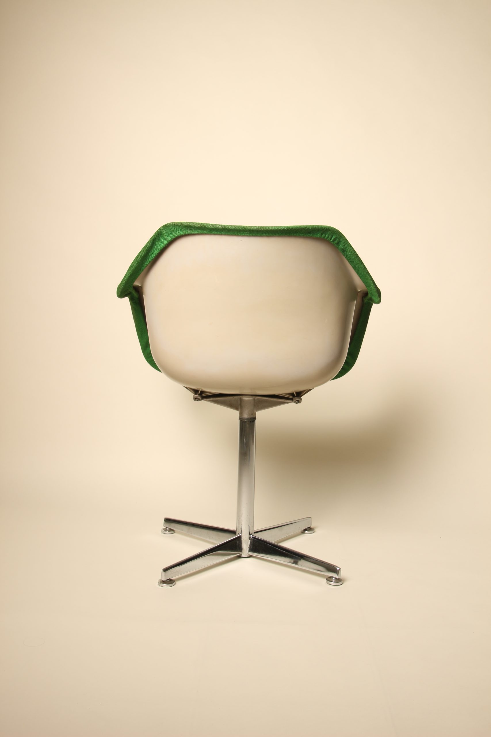 Coque en polypropène thermoformé de couleur ivoire avec revêtement en tissu vert intense, piètement à quatre branches en aluminium chromé non pivotant.