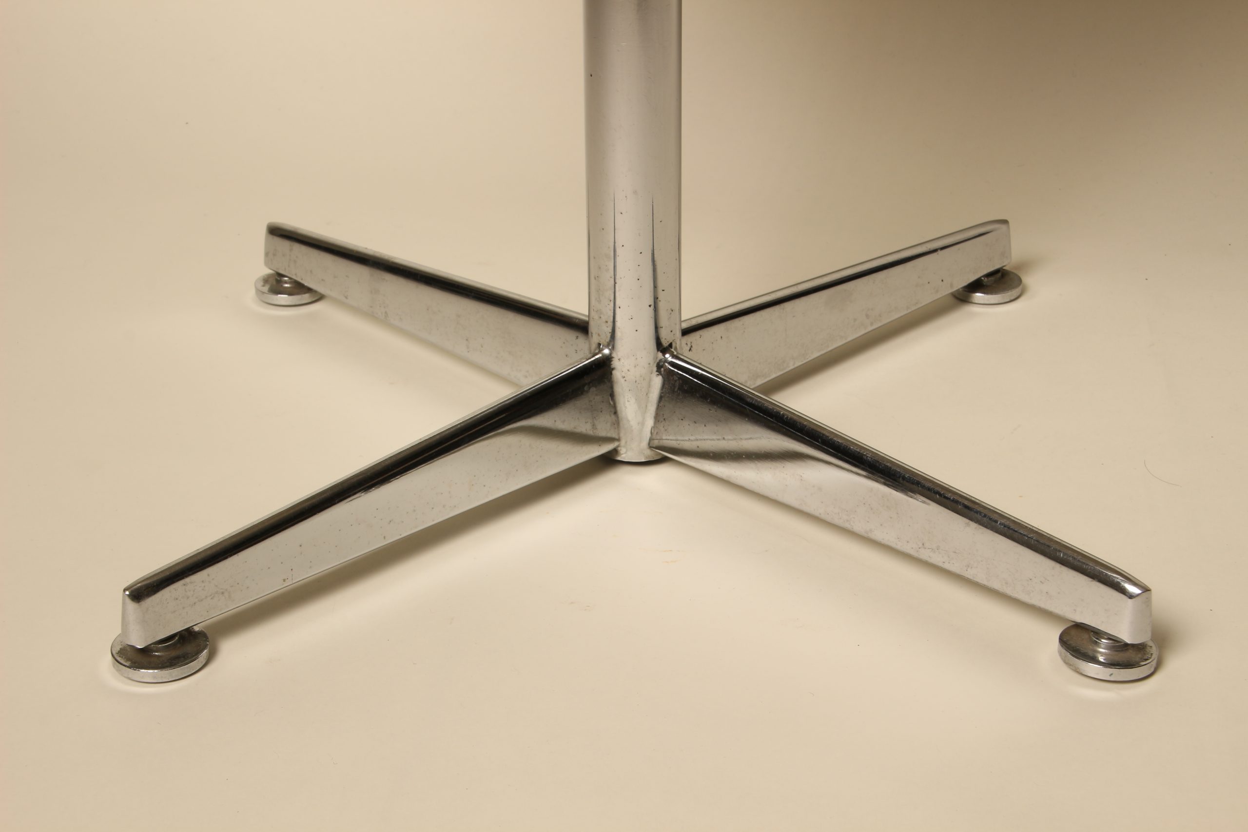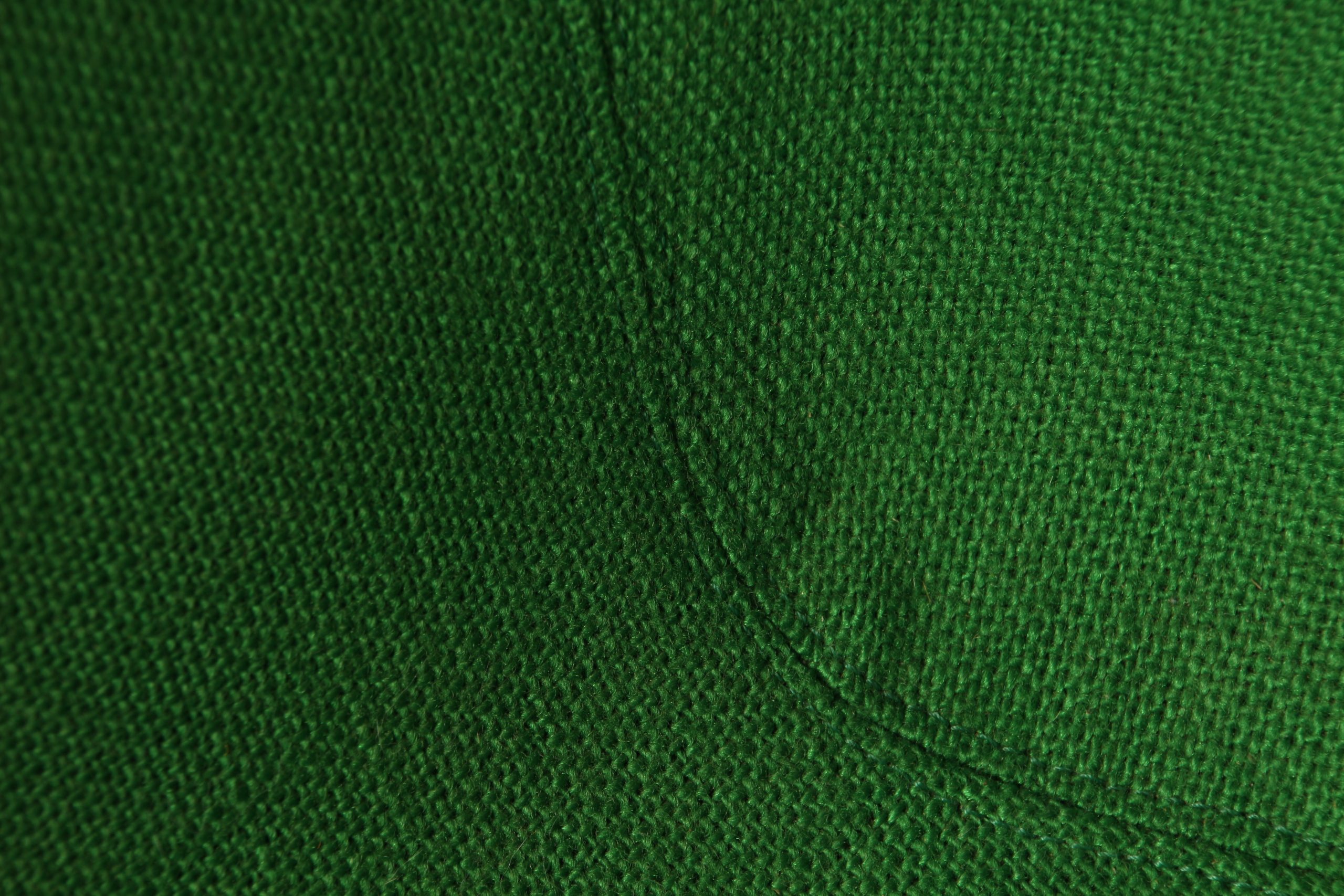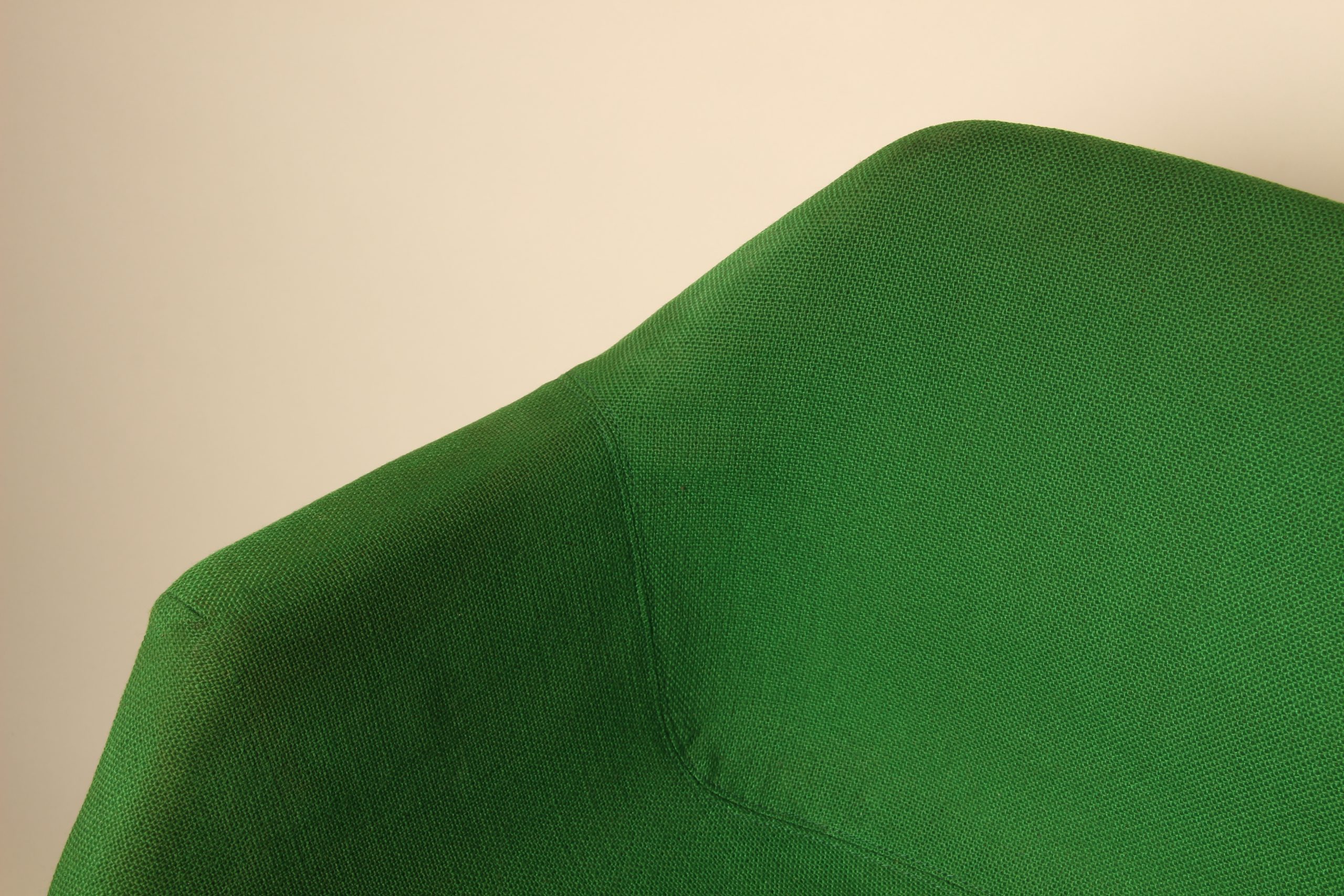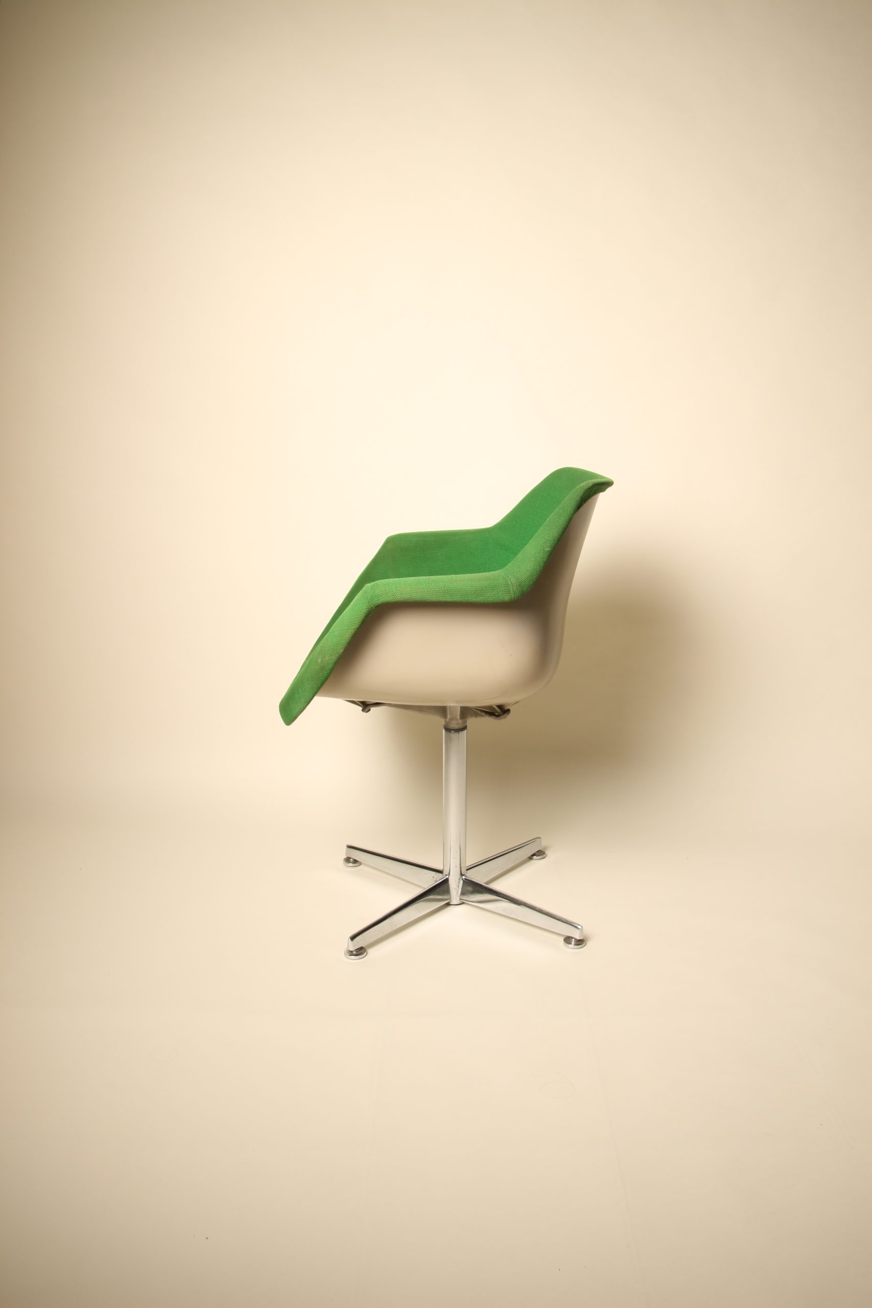 Coque en polypropène thermoformé de couleur ivoire avec revêtement en tissu vert intense, piètement à quatre branches en aluminium chromé non pivotant.