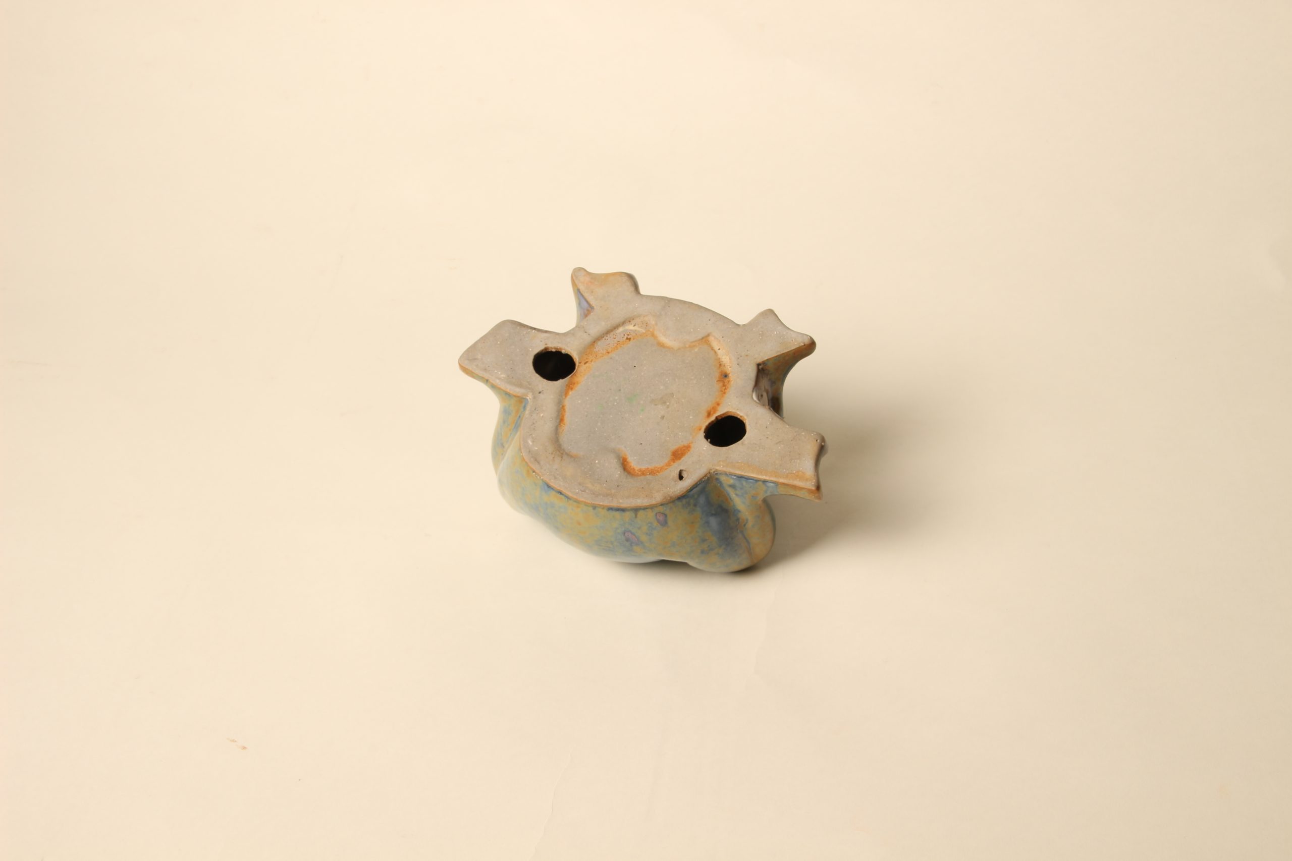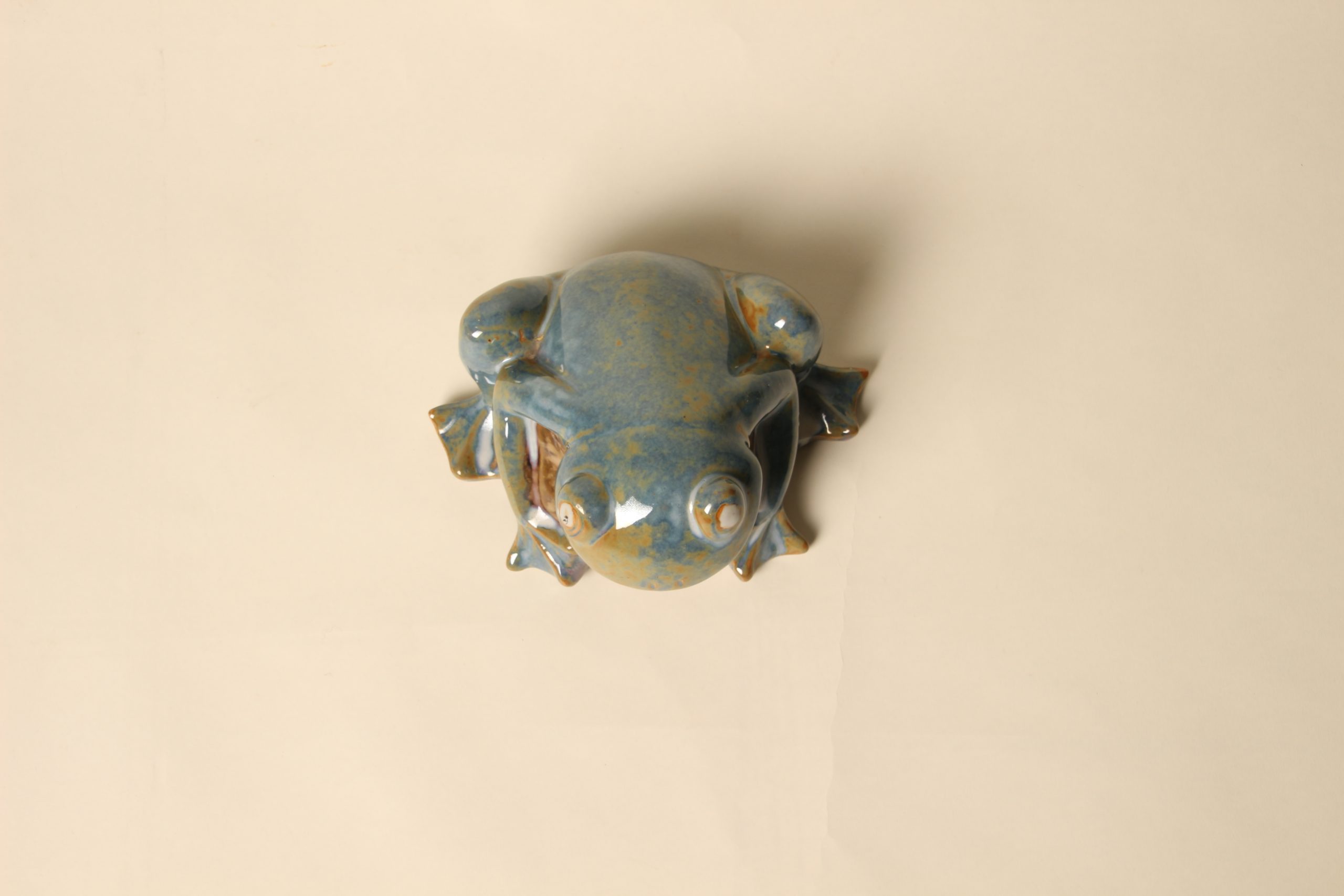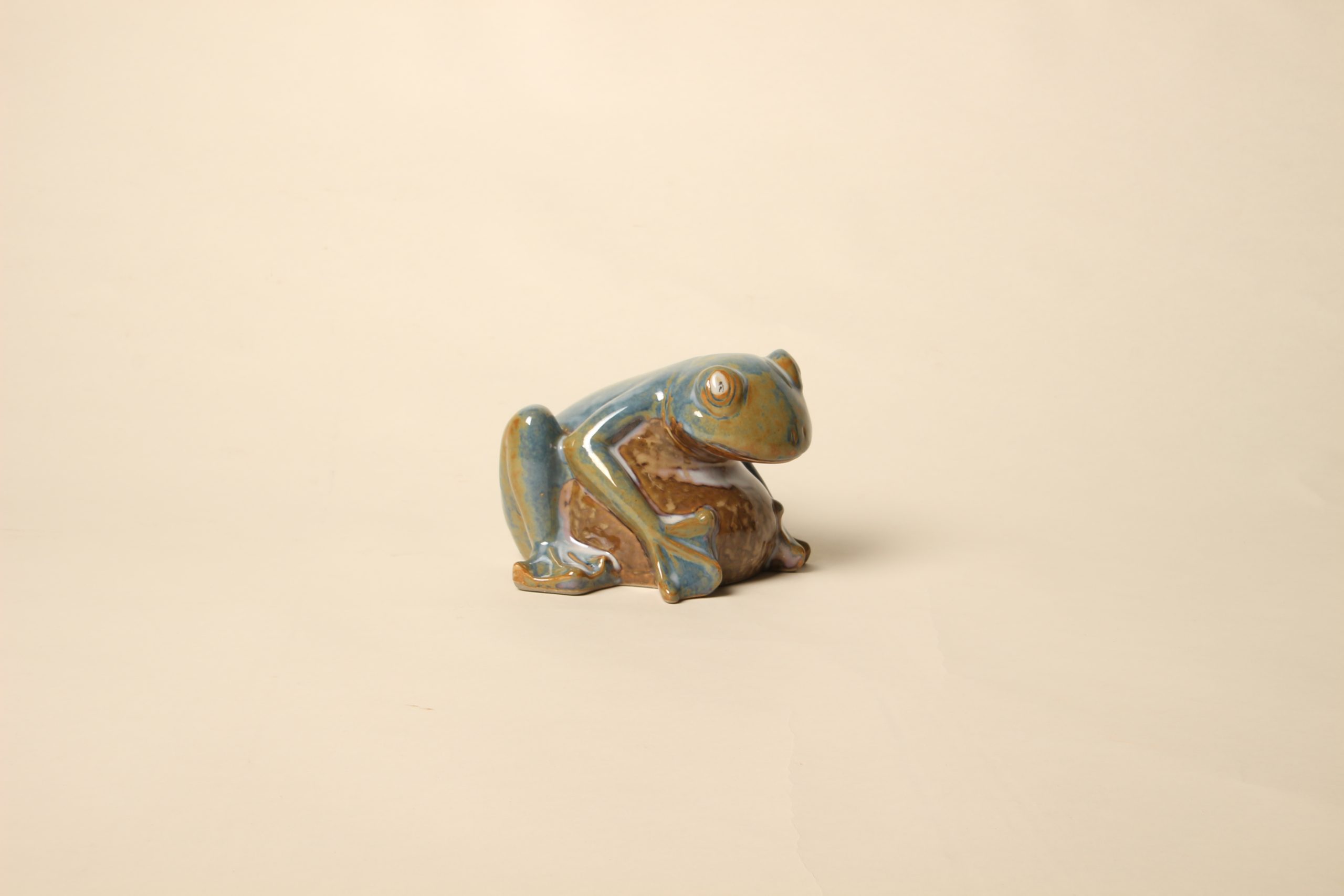 Grenouille sur son caillou en grès émaillé flambé. Riches tons de vert et bleu. Non signée.
