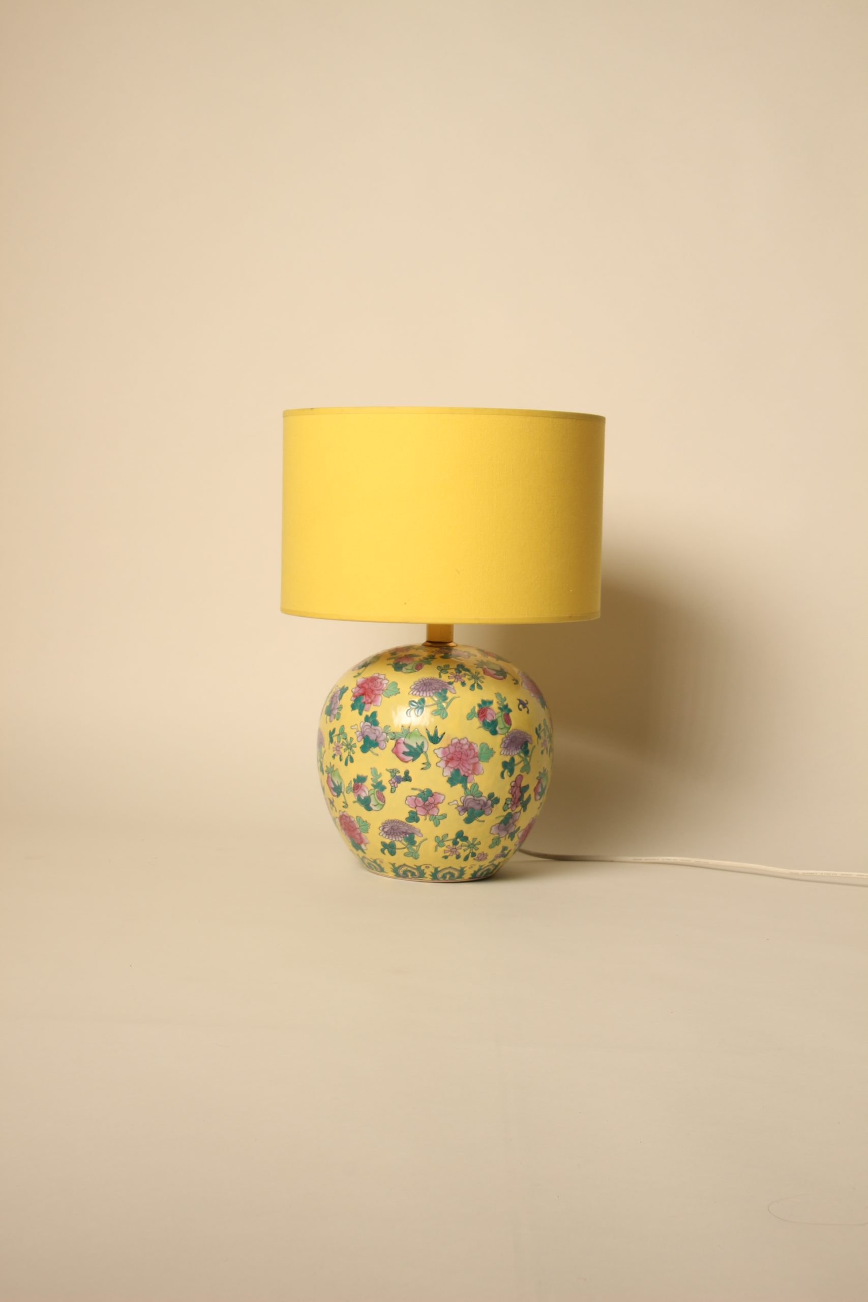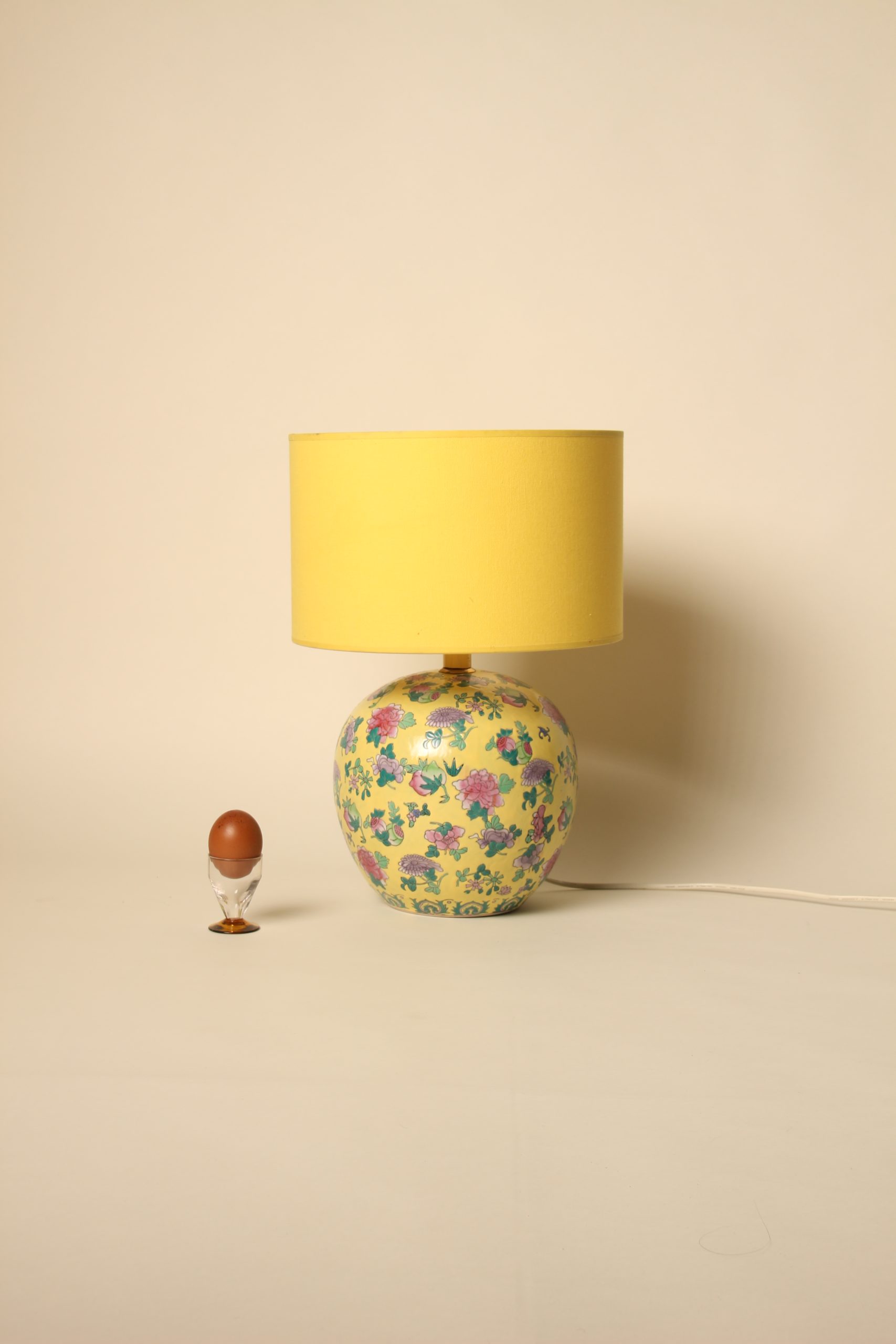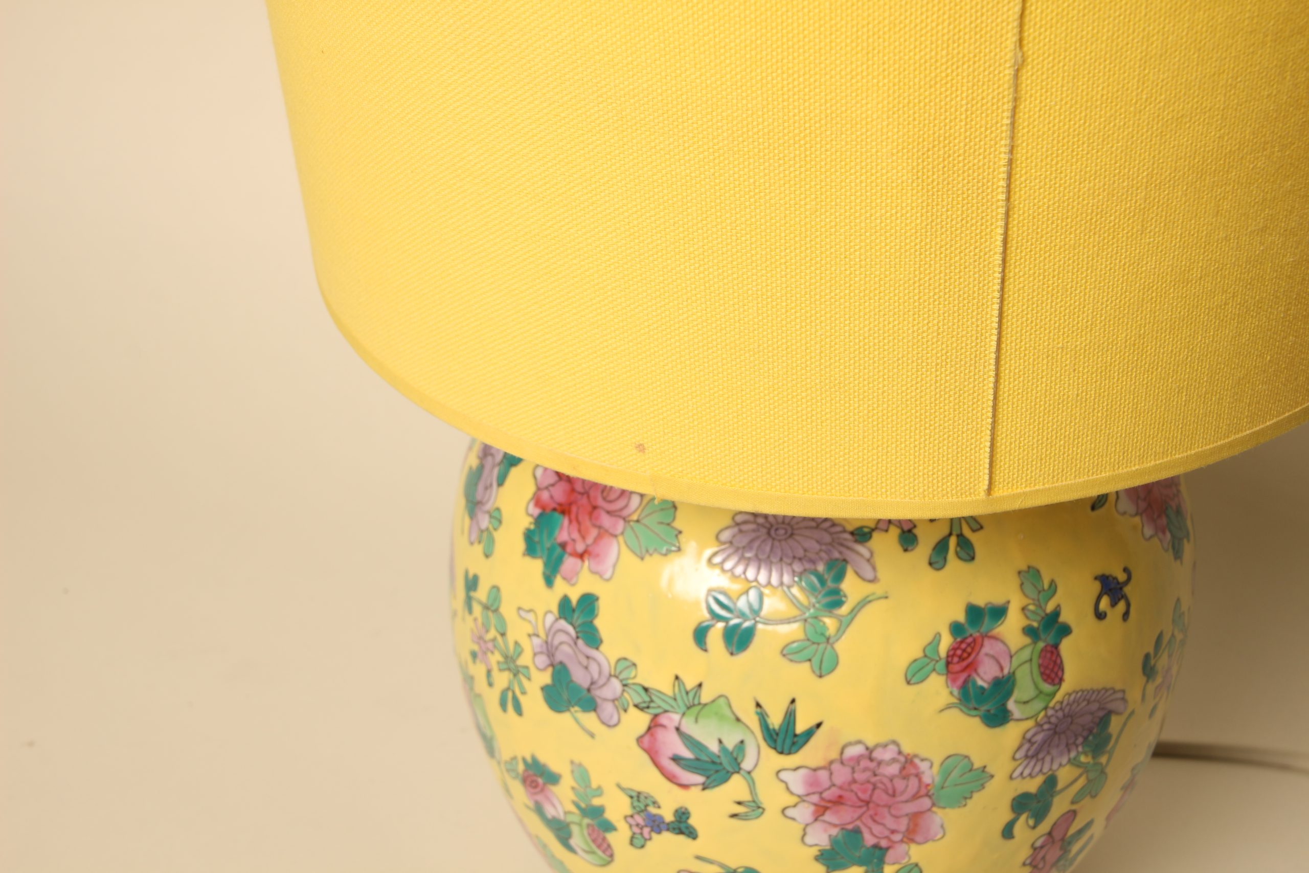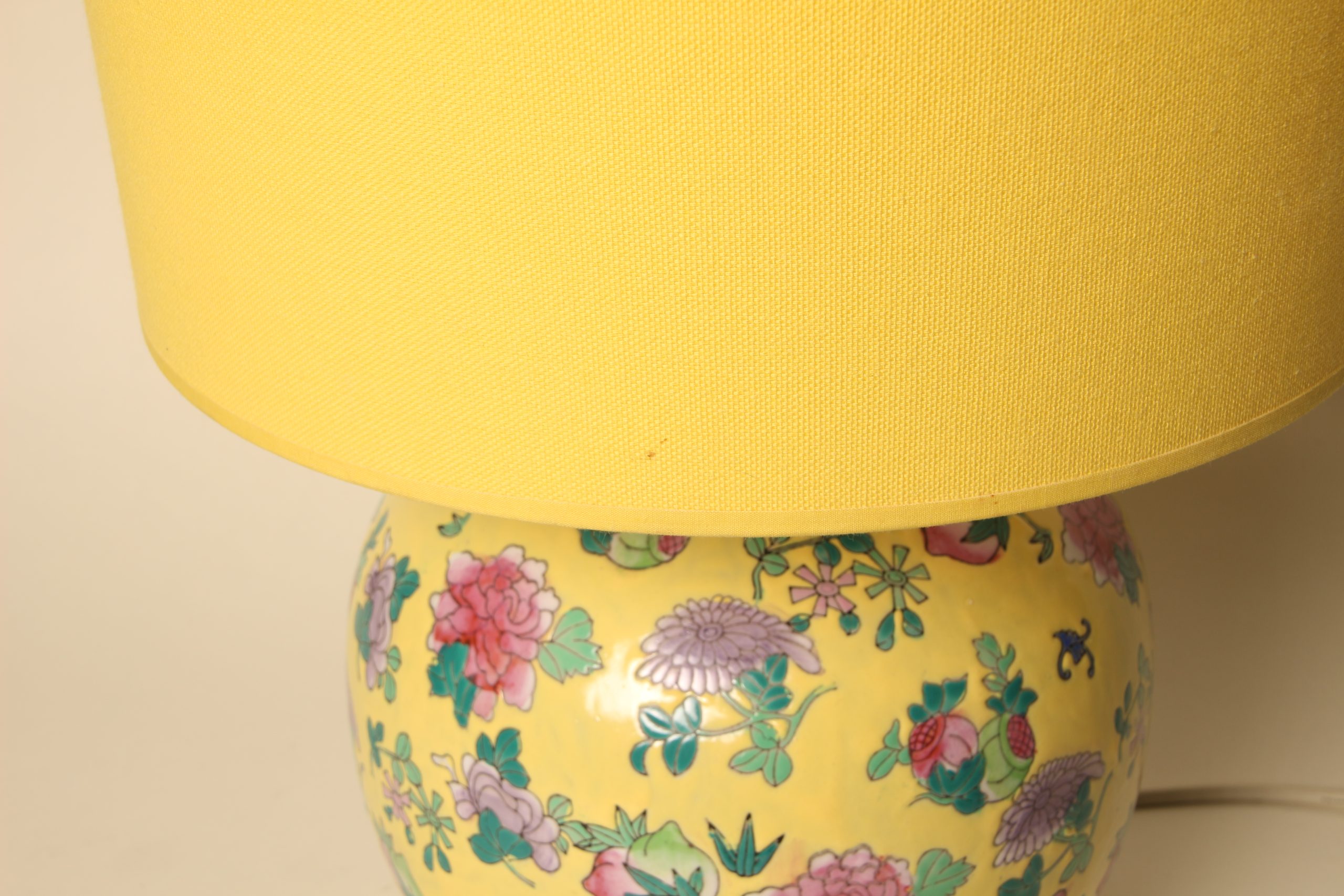Lampe en céramique jaune, motifs floraux légèrement en relief dans le style Chinois famille jaune. Abat-jour jaune vif.