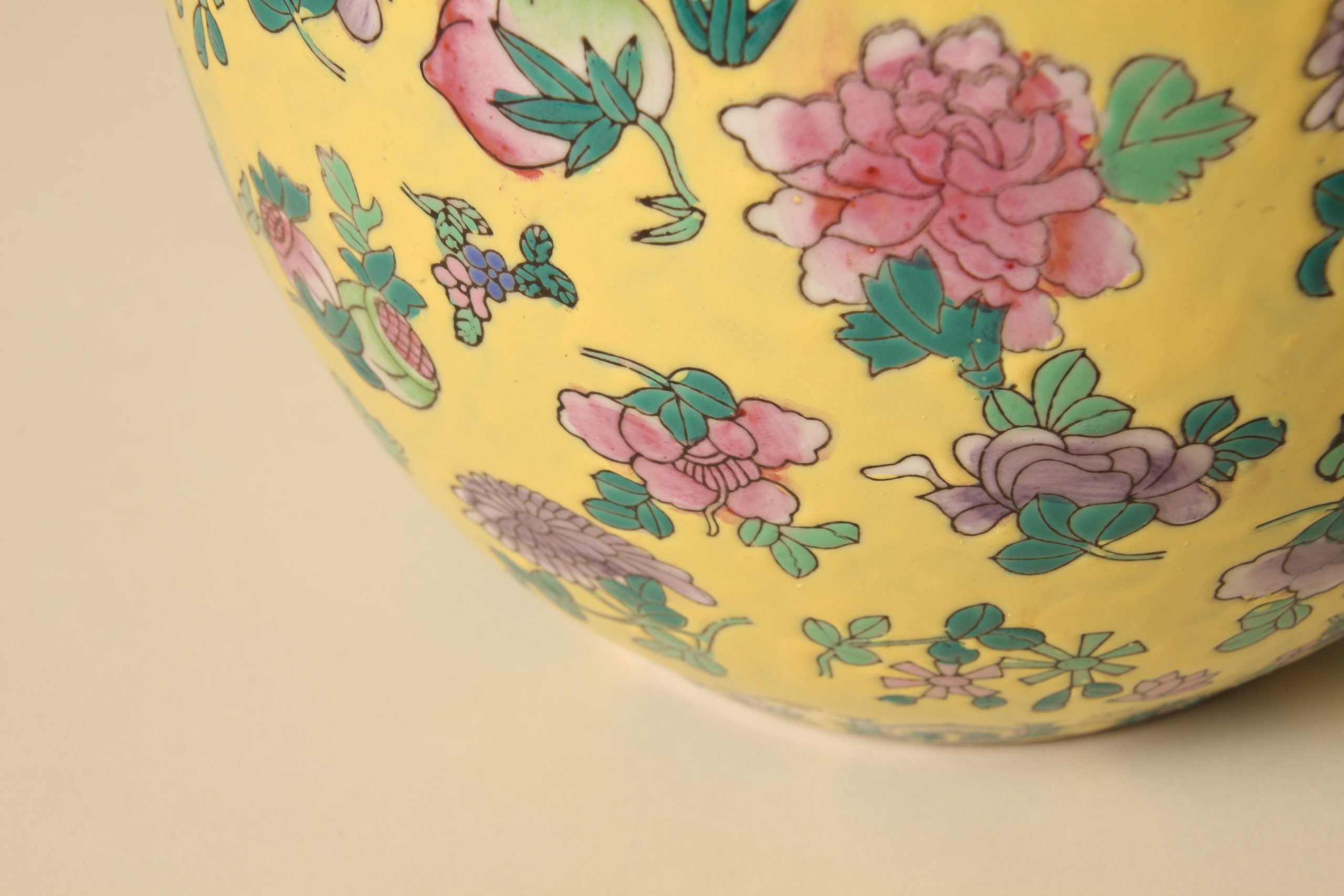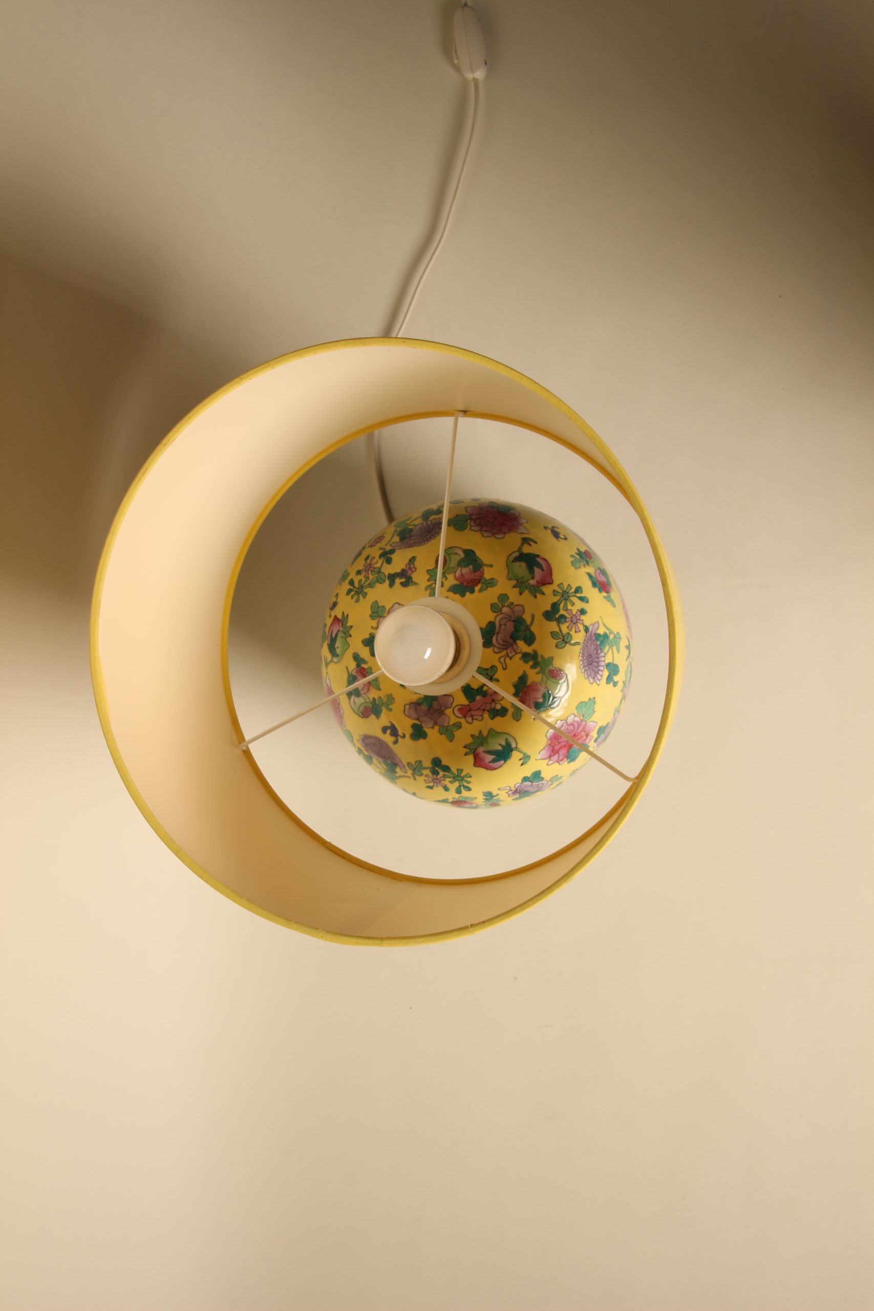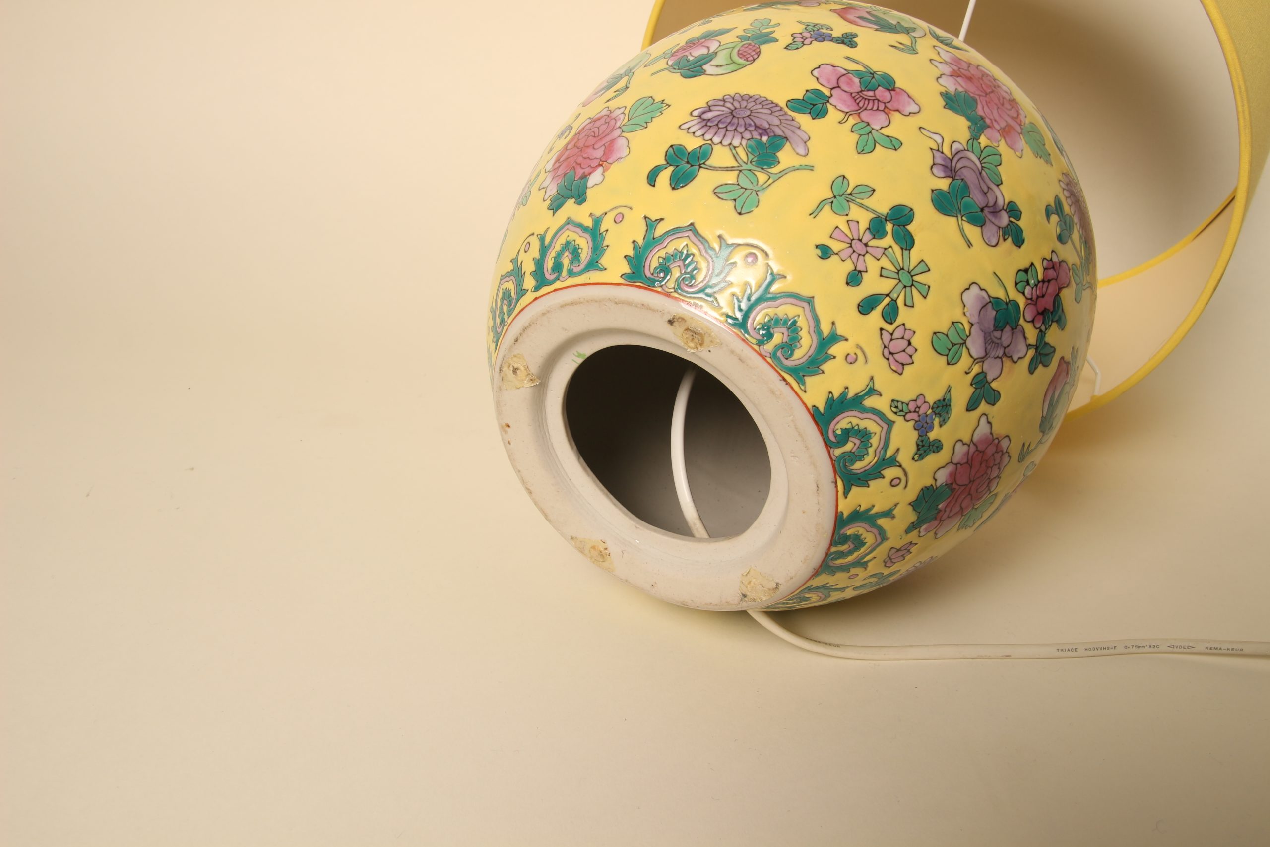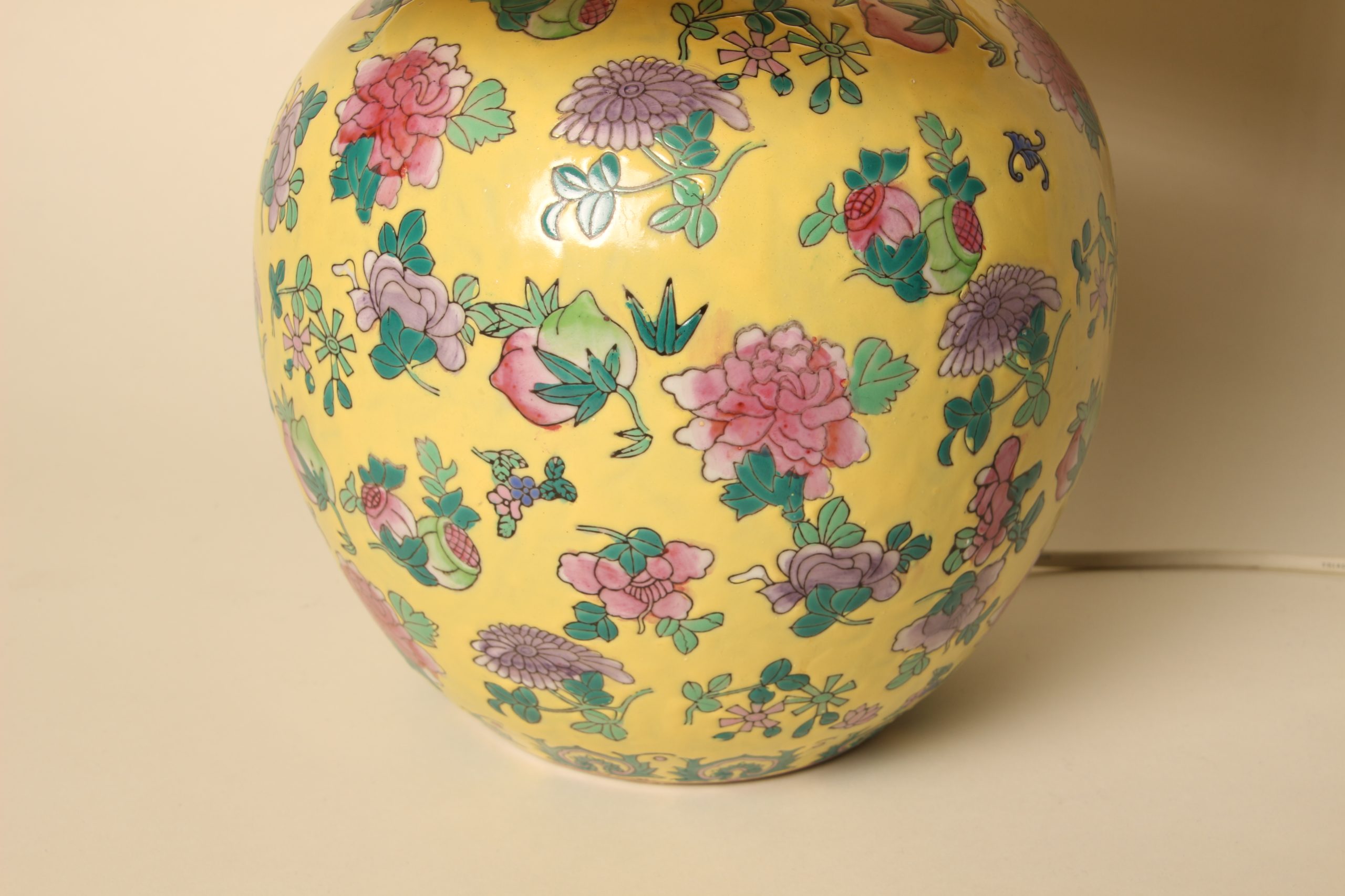 Lampe en céramique jaune, motifs floraux légèrement en relief dans le style Chinois famille jaune. Abat-jour jaune vif.