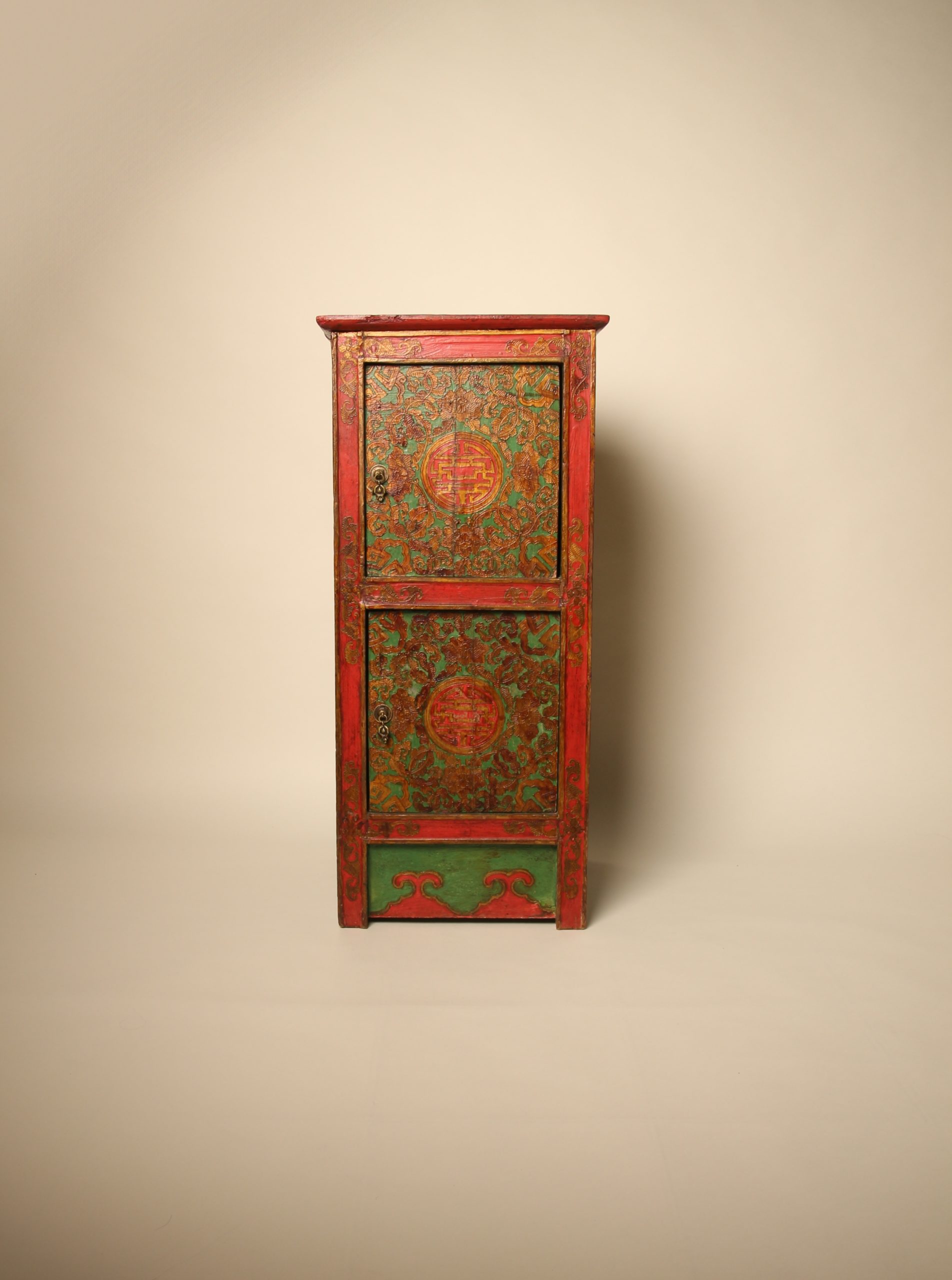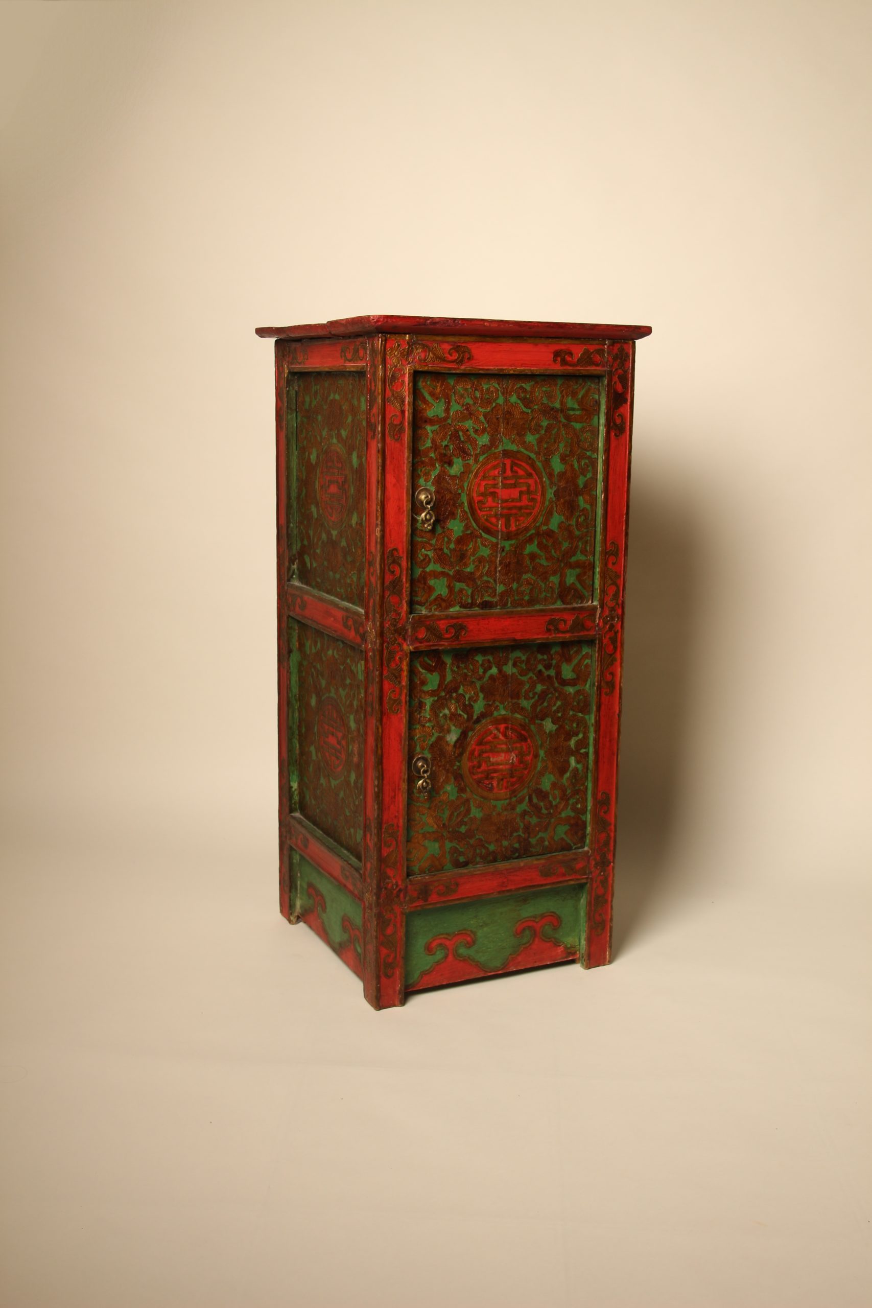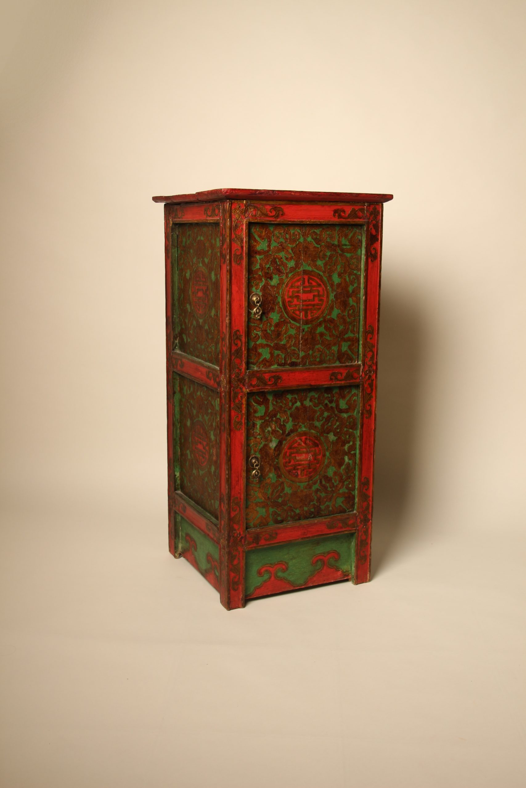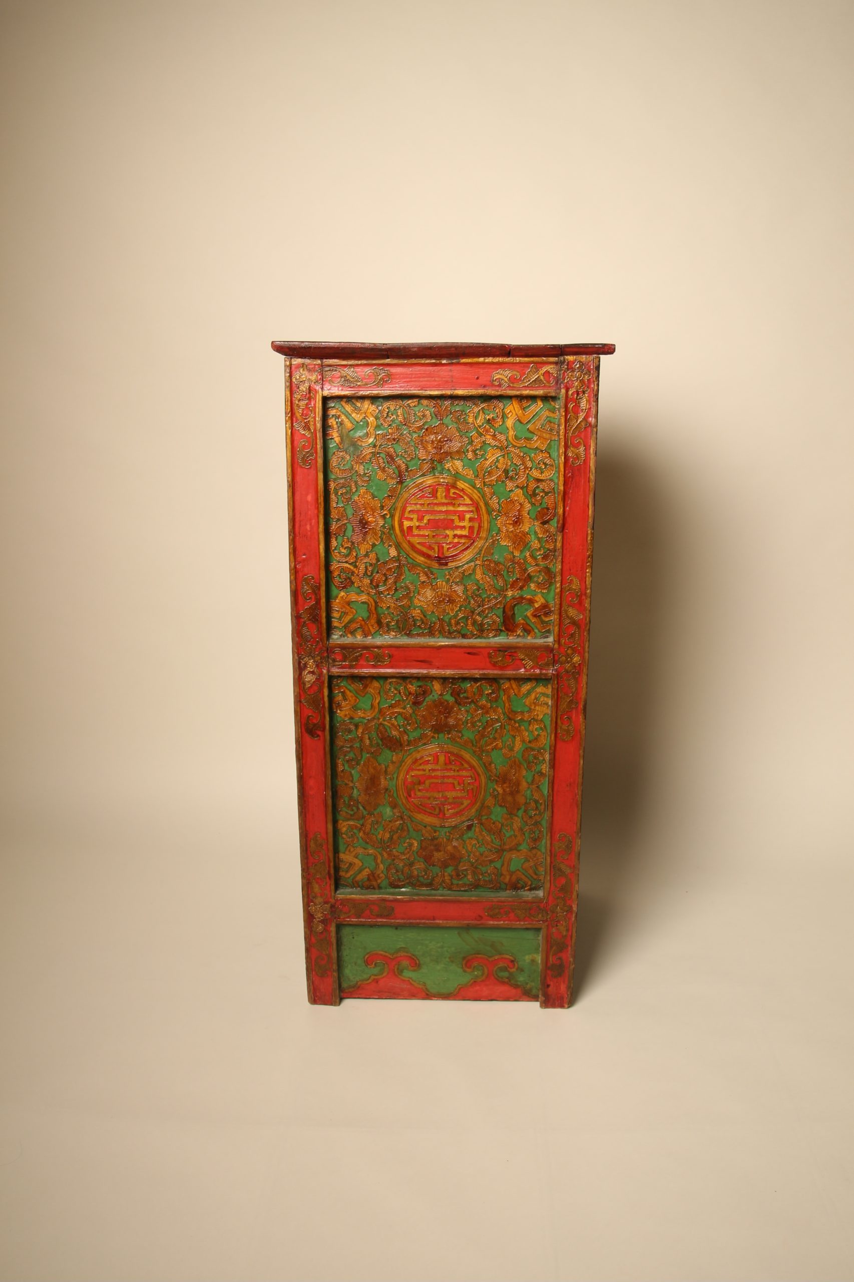 Meuble colonne à deux portes Tibétain entièrement peint à la main, en bois massif. La face et les deux côtés du meuble sont peints de motifs floraux et de bon augure dans les tons de verts, rouges et dorés en relief. Ces cabinets tibétains en forme de colonnes étaient placés de part et d’autres d’un autel pour soutenir la structure centrale ou exposer des objets sacrés. Avec le temps ils ont ensuite pu être utilisés d’éléments décoratifs ou de stockage domestique.