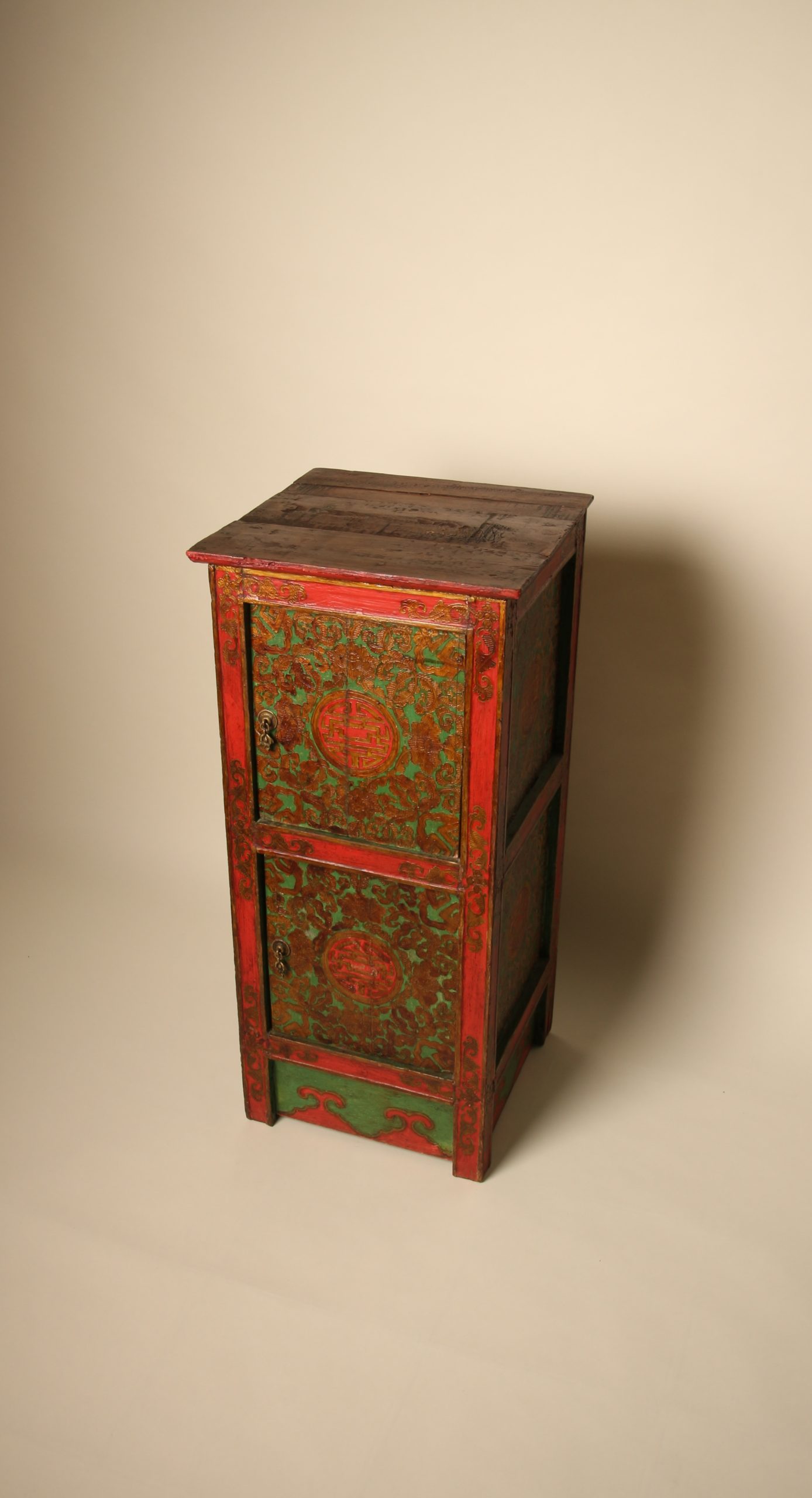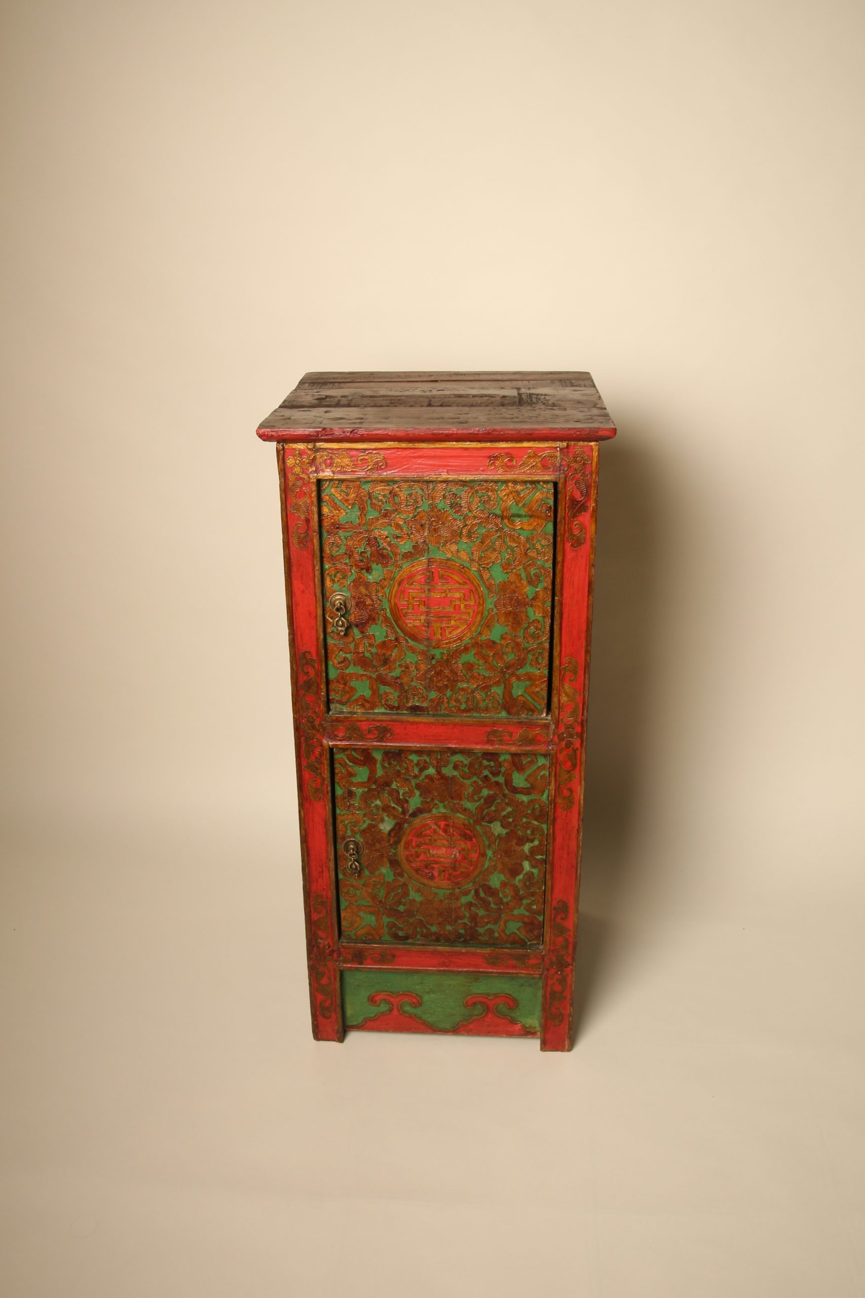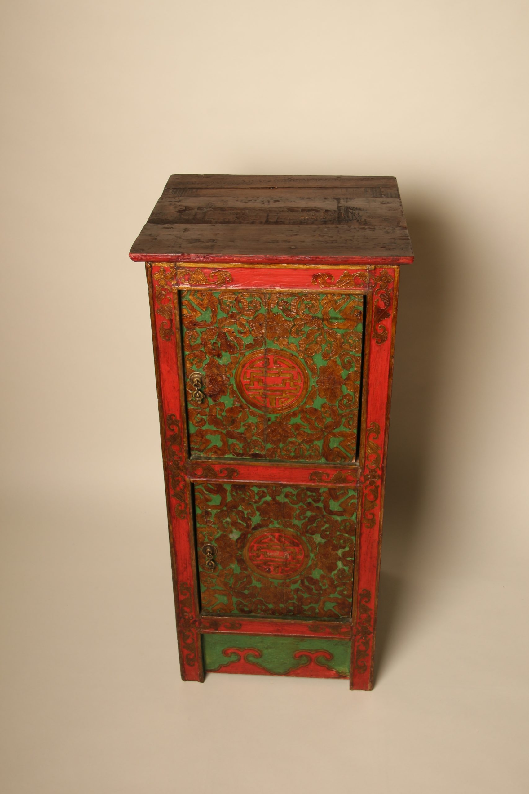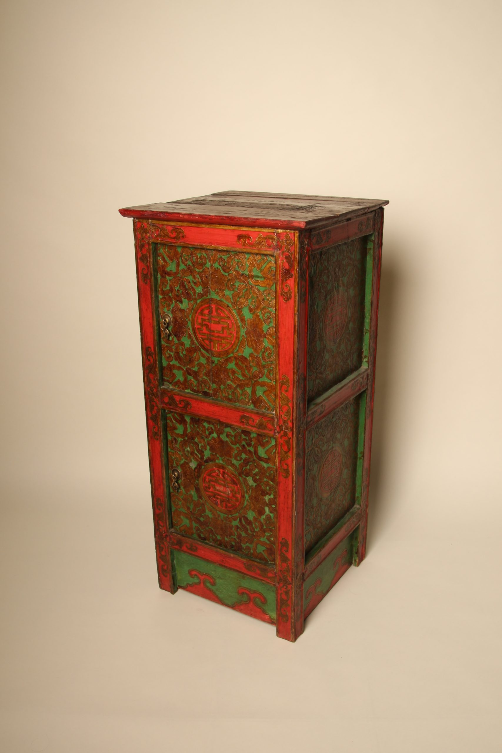 Meuble colonne à deux portes Tibétain entièrement peint à la main, en bois massif. La face et les deux côtés du meuble sont peints de motifs floraux et de bon augure dans les tons de verts, rouges et dorés en relief. Ces cabinets tibétains en forme de colonnes étaient placés de part et d’autres d’un autel pour soutenir la structure centrale ou exposer des objets sacrés. Avec le temps ils ont ensuite pu être utilisés d’éléments décoratifs ou de stockage domestique.