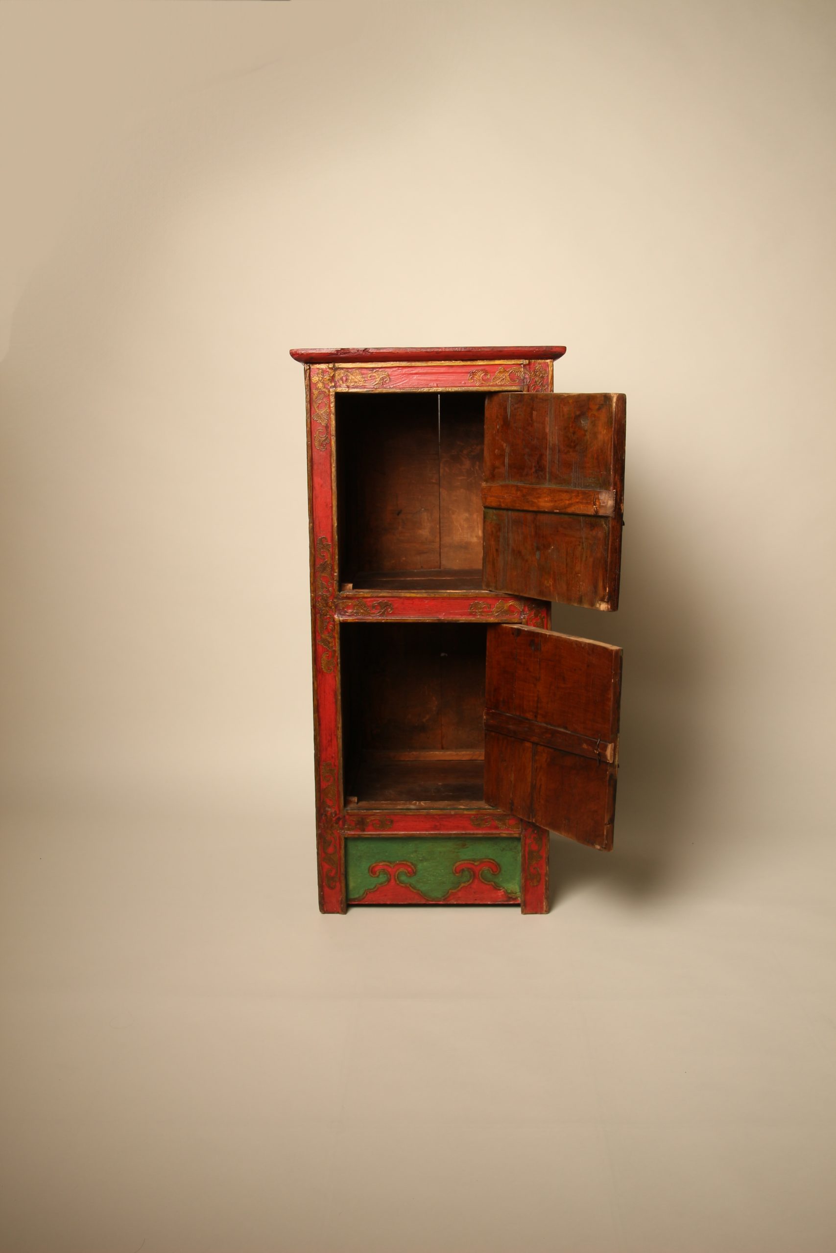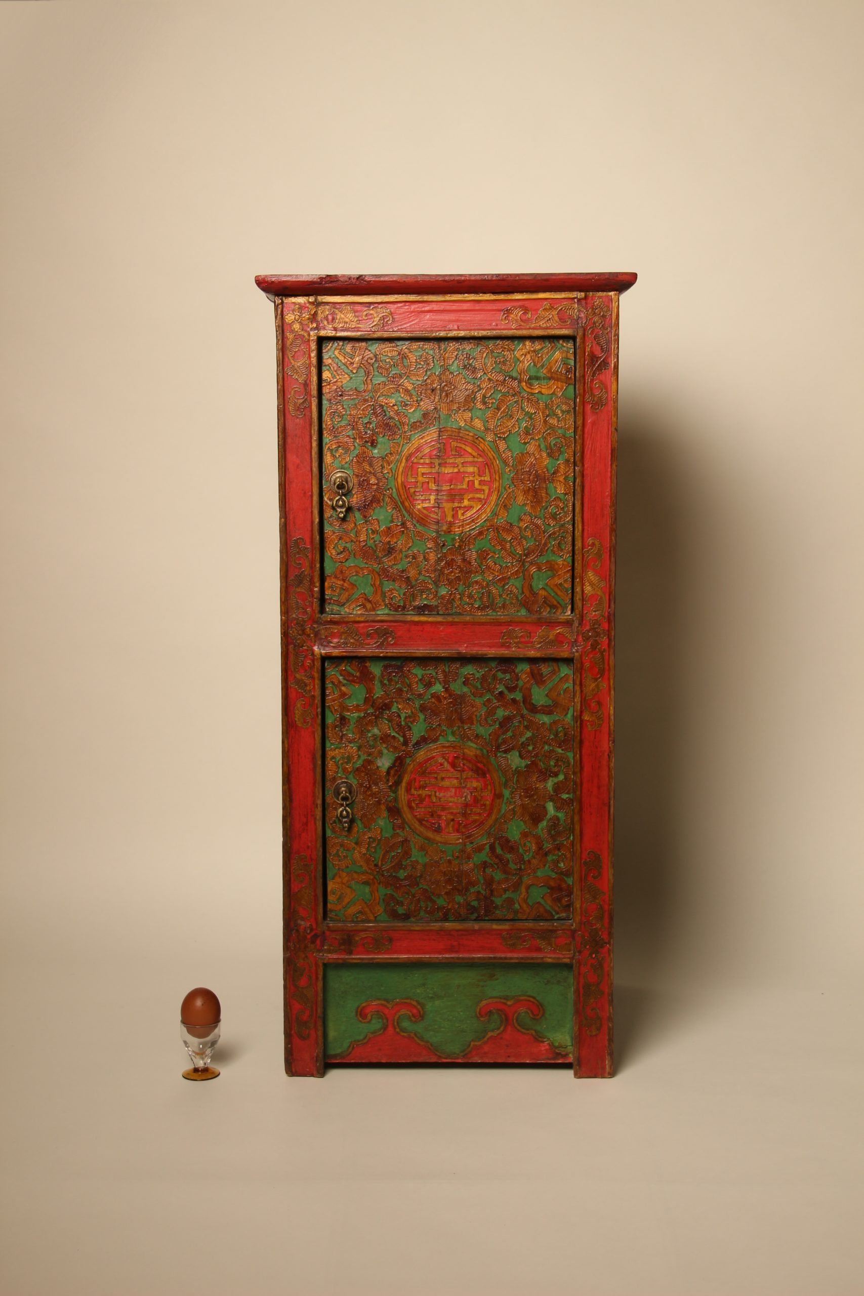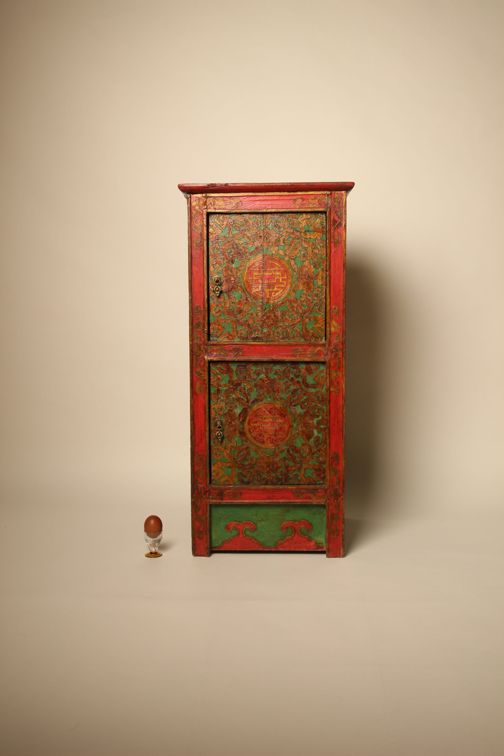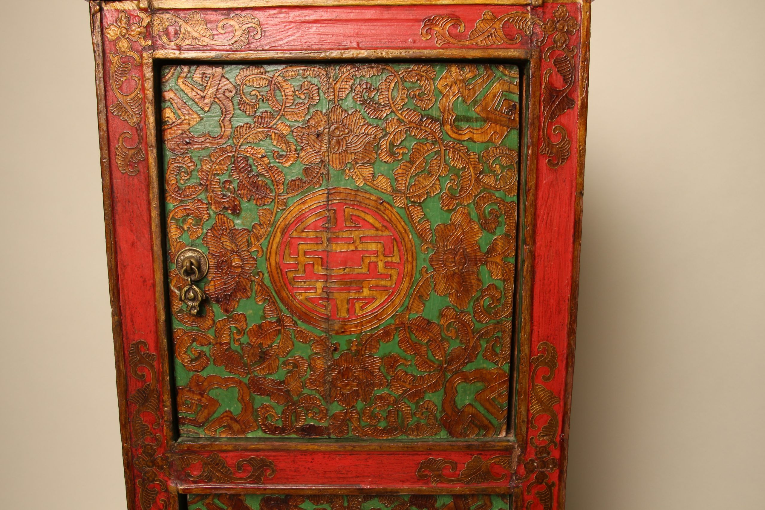 Meuble colonne à deux portes Tibétain entièrement peint à la main, en bois massif. La face et les deux côtés du meuble sont peints de motifs floraux et de bon augure dans les tons de verts, rouges et dorés en relief. Ces cabinets tibétains en forme de colonnes étaient placés de part et d’autres d’un autel pour soutenir la structure centrale ou exposer des objets sacrés. Avec le temps ils ont ensuite pu être utilisés d’éléments décoratifs ou de stockage domestique.