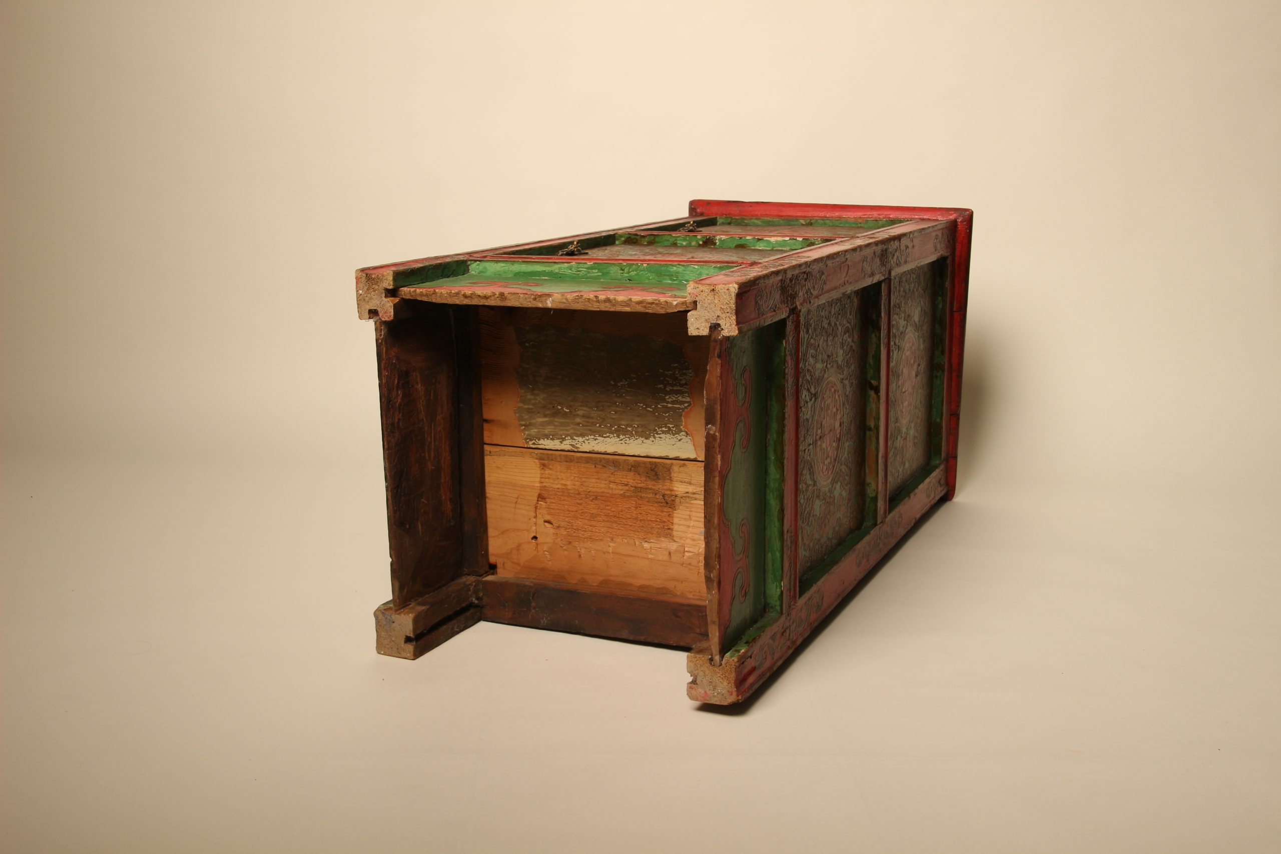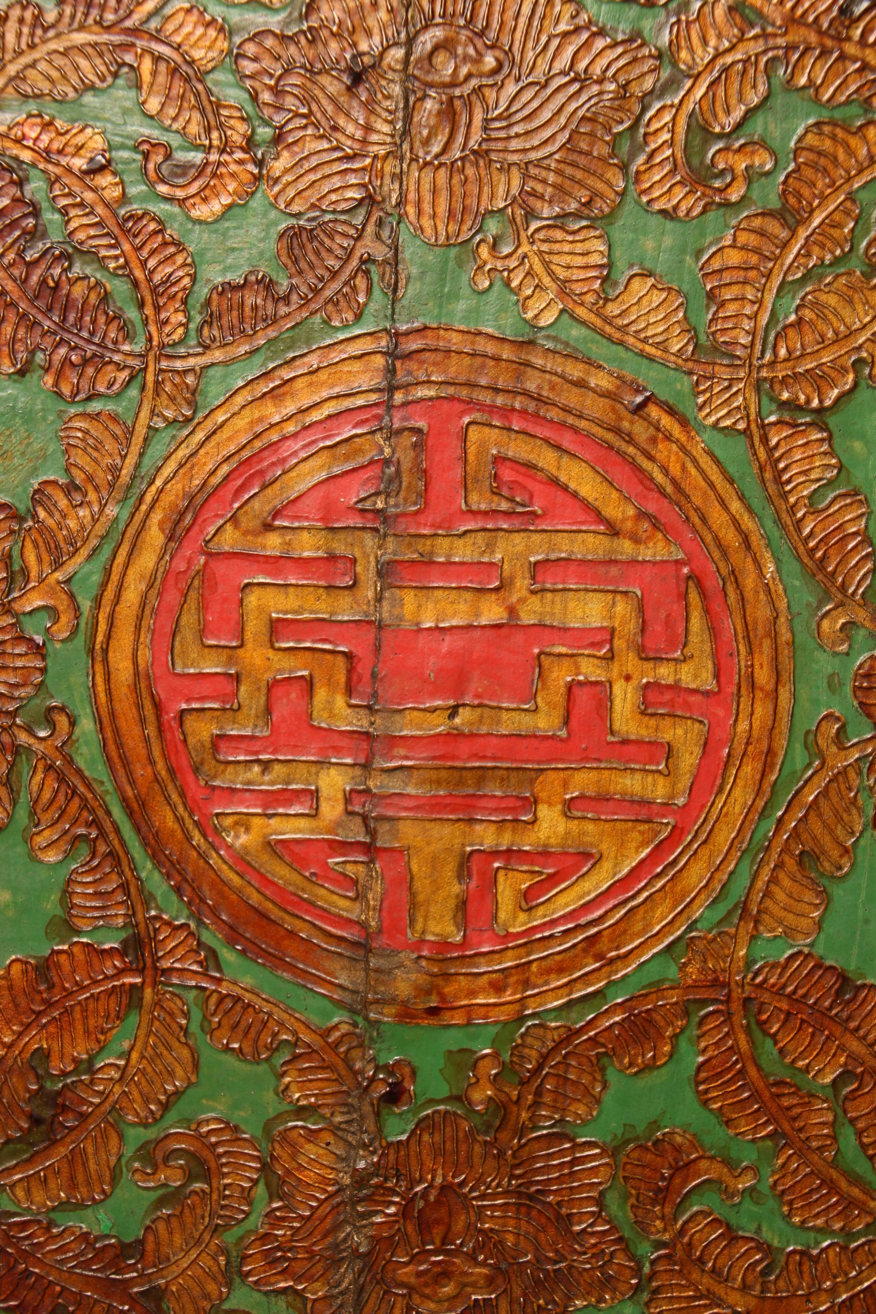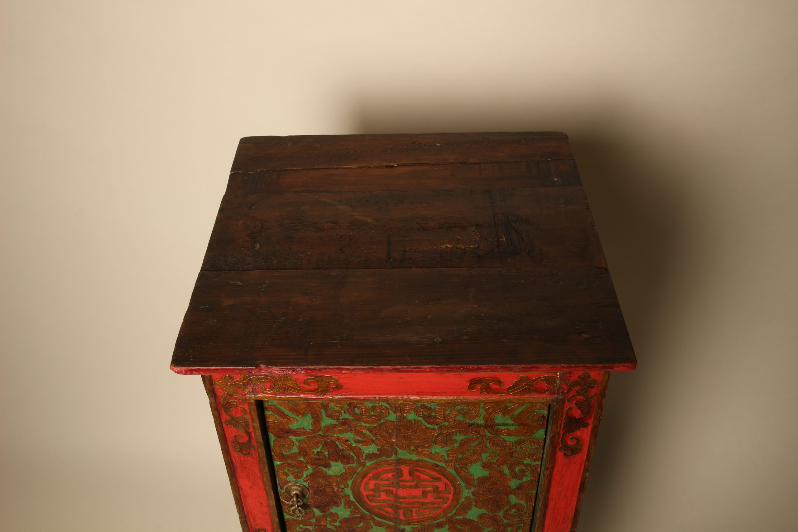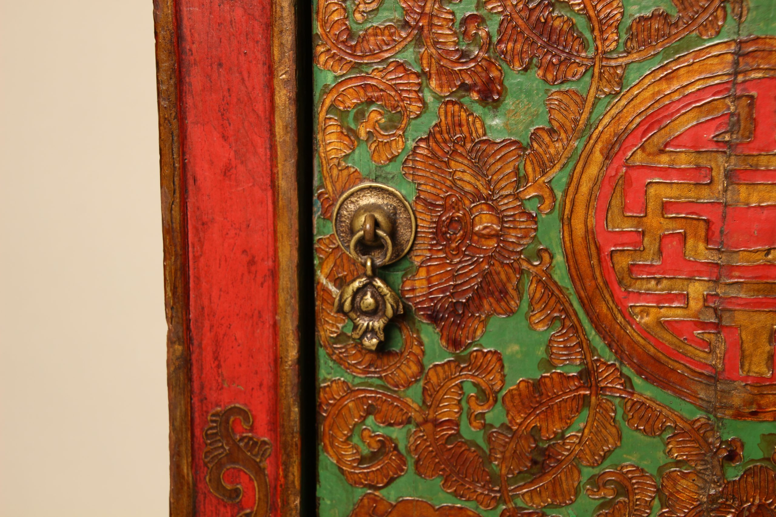 Meuble colonne à deux portes Tibétain entièrement peint à la main, en bois massif. La face et les deux côtés du meuble sont peints de motifs floraux et de bon augure dans les tons de verts, rouges et dorés en relief. Ces cabinets tibétains en forme de colonnes étaient placés de part et d’autres d’un autel pour soutenir la structure centrale ou exposer des objets sacrés. Avec le temps ils ont ensuite pu être utilisés d’éléments décoratifs ou de stockage domestique.