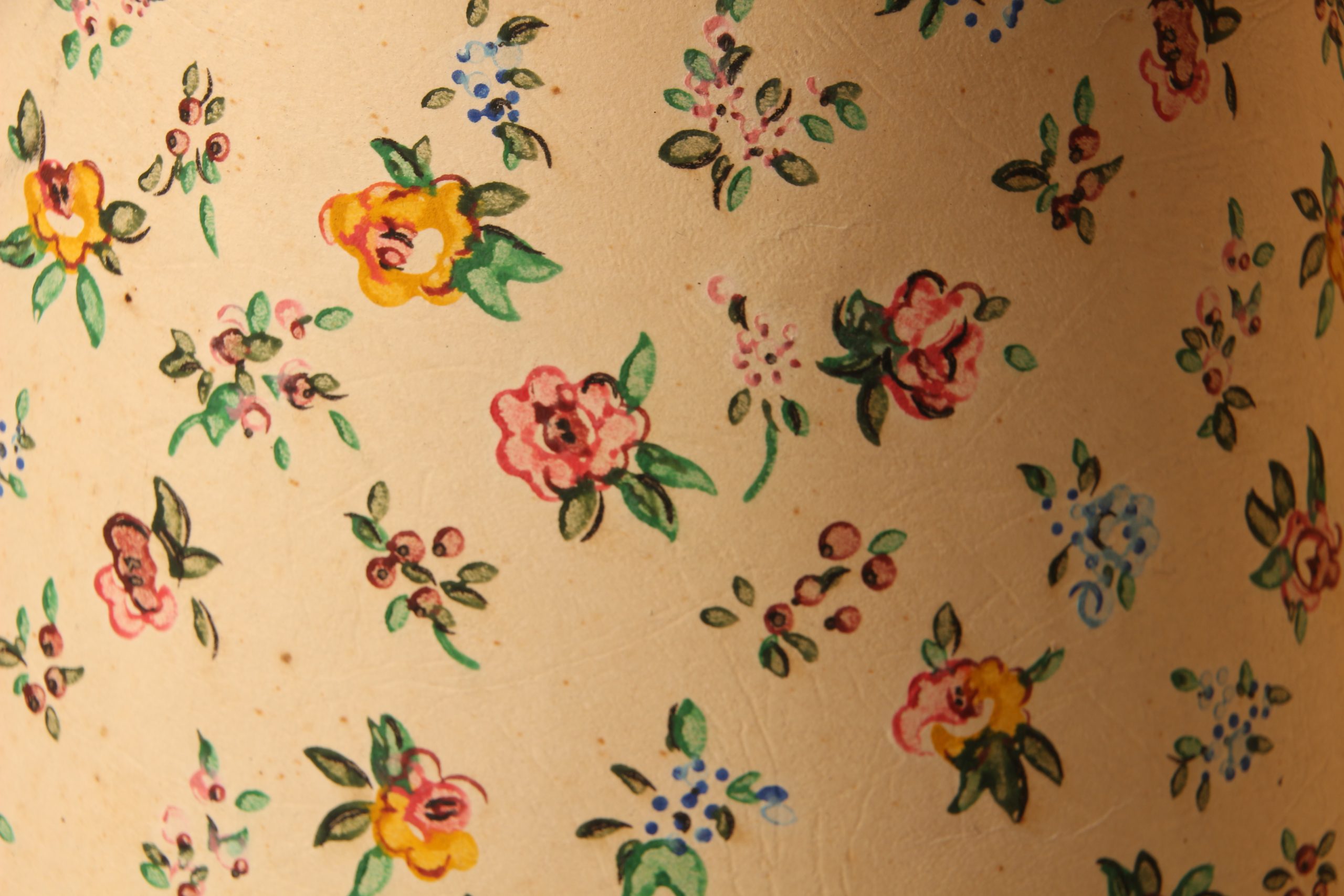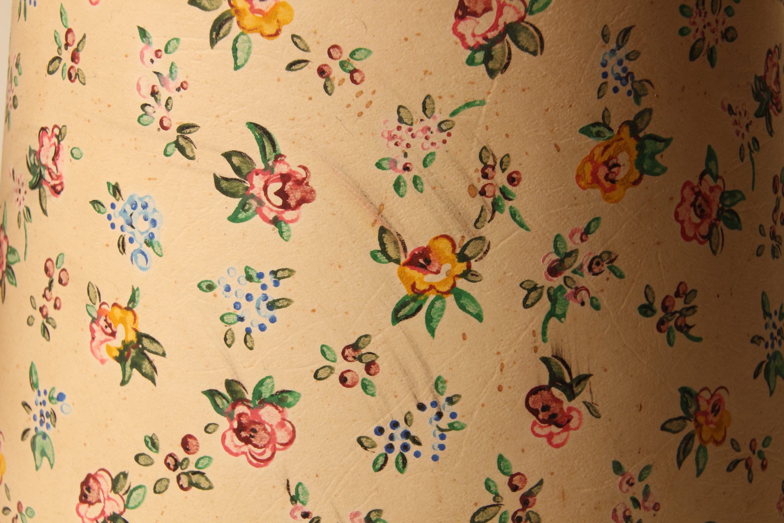 Abat-jour aux motifs millefleurs multicolores sur toile cartonnée épaisse.