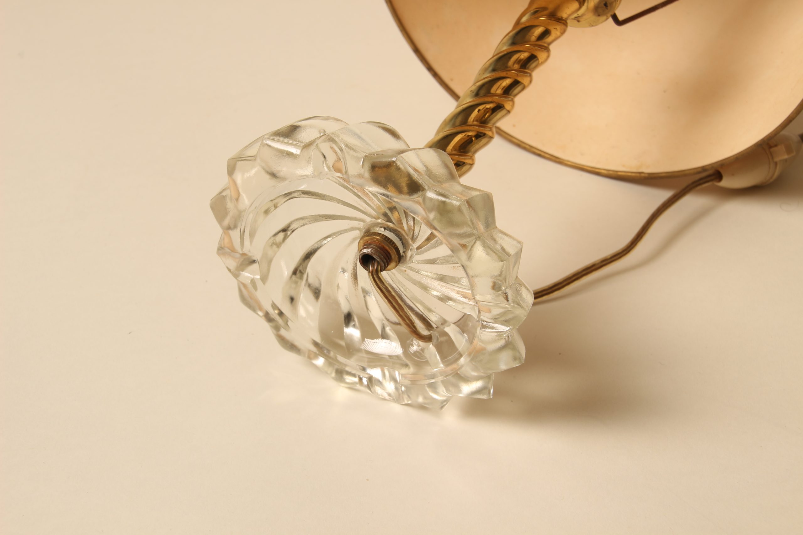 Paire de lampes de chevets en verre pressé moulé, laiton torsadé doré et abat-jour block print peints à la main.