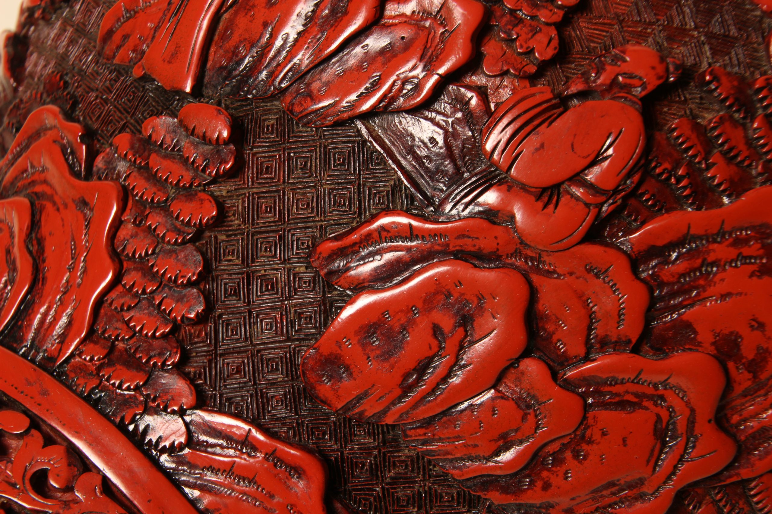 Grand vase balustre en laque de cinabre rouge sur bois; décors sculptés en reliefs de personnages et de paysages. Col et talon à décor de motifs floraux et arabesques.